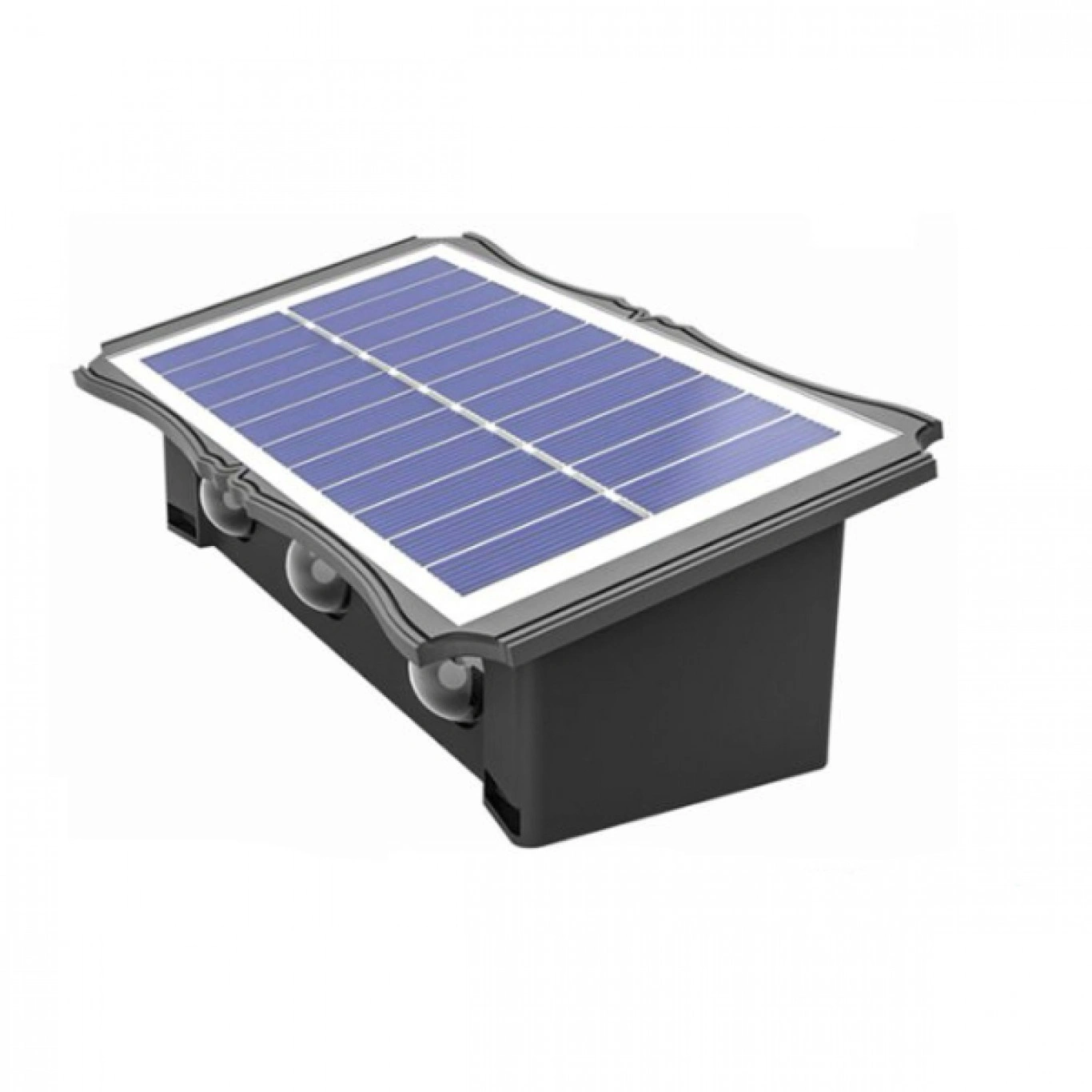 Επιτοίχιο ηλιακό φωτιστικό με θερμό λευκό φωτισμό. Την μέρα συγκεντρώνει και αποθηκεύει στις επαναφορτιζόμενες μπαταρίες ηλιακή ενέργεια και με το φωτοκύτταρο ανάβει αυτόματα την νύχτα.