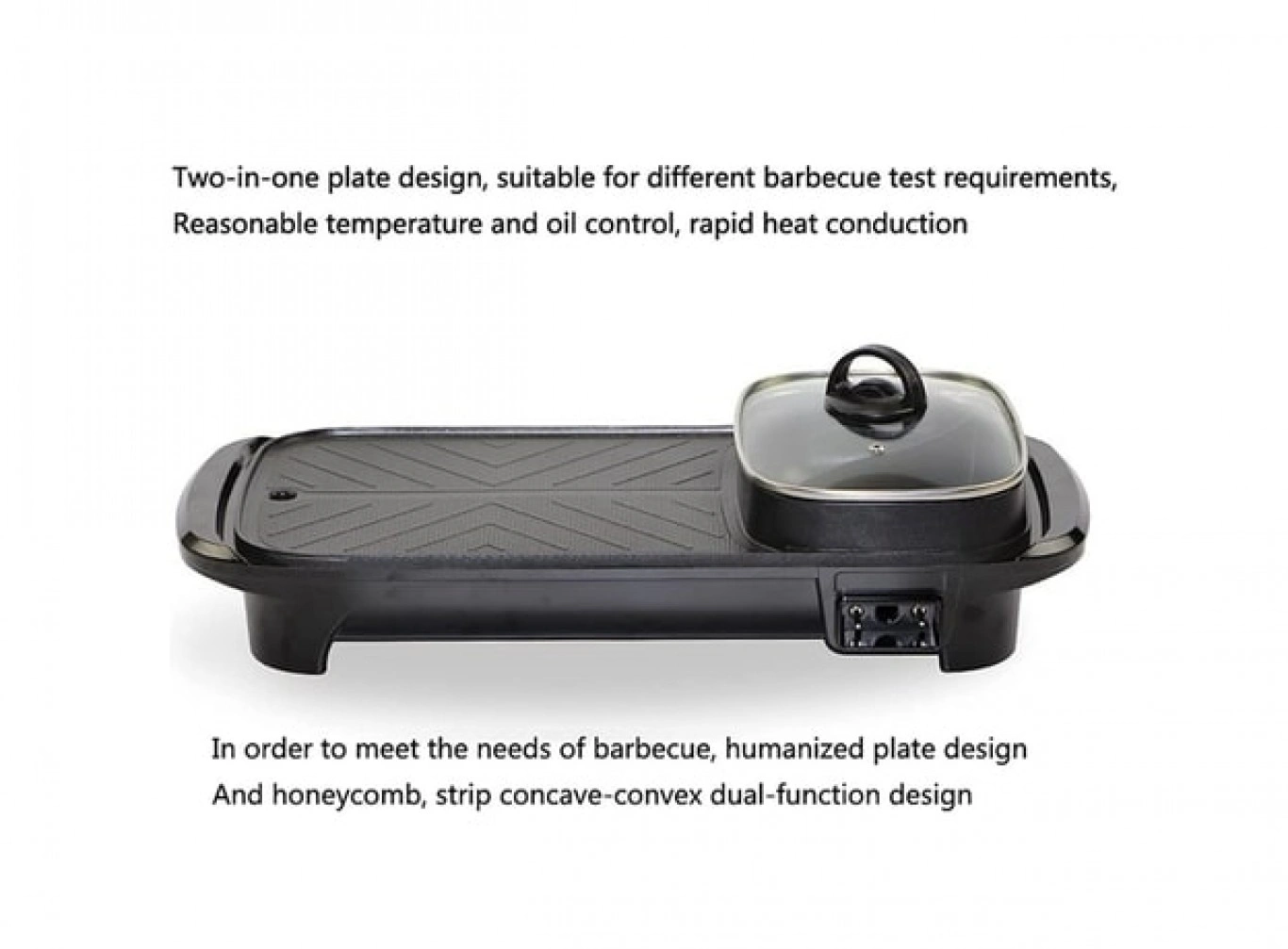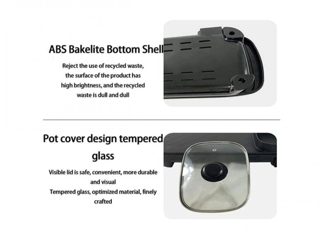 Teppanyaki Grill – ηλεκτρικό τηγάνι με κατσαρόλα 2 σε 1, με θέρμανση υψηλής ισχύος 1360W, το οποίο διαθέτει:✔️Οπτικό κάλυμμα: γυάλινο, ανθεκτικό καπάκι ενισχυμένης επεξεργασίας, που σας επιτρέπει να παρακολουθείτε το μαγείρεμα του φαγητού σας.✔️Ανθεκτική λαβή: λαβή με υψηλή αντοχή στη θερμοκρασία, η οποία εμποδίζει την απορρόφηση θερμότητας.✔️Αντικολλητική επίστρωση: τα τρόφιμα δεν κολλάνε στον πάτο και δεν καίγονται εύκολα. Αυτό συνιστά ένα υγιές μαγείρεμα και ταυτόχρονα εύκολο καθαρισμό.✔️Ελεγκτής θερμοκρασίας πολλαπλών ταχυτήτων: μπορείτε να ρυθμίσετε τη θερμοκρασία μαγειρέματος με 5 διαφορετικές επιλογές.✔️Εξοικονόμηση ενέργειας υψηλής απόδοσης: το σώμα θέρμανσης και το σώμα του δοχείου, εξασφαλίζουν ότι η θερμότητα χρησιμοποιείται στα τρόφιμα, το οποίο εξοικονομεί ενέργεια και το καθιστά οικονομικό στη λειτουργία του.✔️Ισχυρό και πρακτικό: μπορεί να χρησιμοποιηθεί ως τηγάνι, χύτρα, κατσαρόλα, γκριλιέρα.