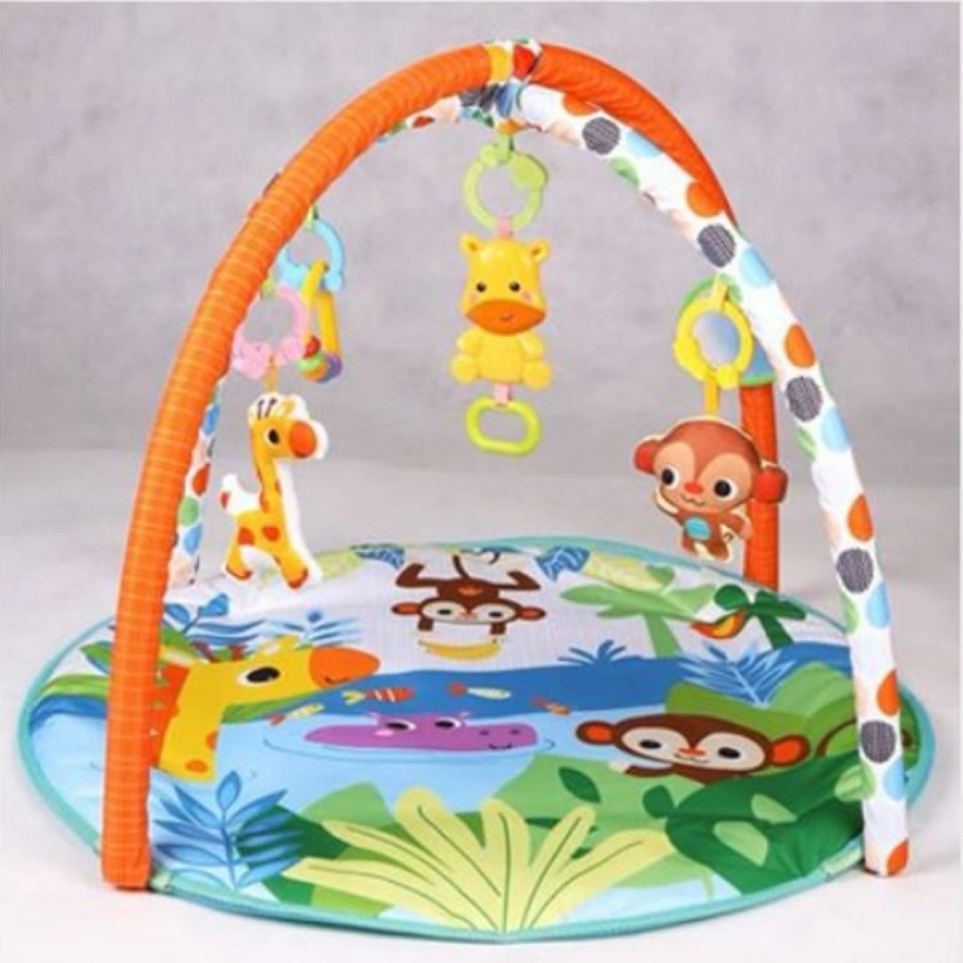 Το εκπαιδευτικό ευρύχωρο γυμναστήριο – χαλάκι , διαμορφώνει τη φαντασία του παιδιού, διδάσκει πώς να διακρίνει μεταξύ σχημάτων και χρωμάτων και αναπτύσσει τις αισθήσεις αφής και όρασης με διάφορα αισθητικά και γνωστικά χαρακτηριστικά. Κατασκευασμένο από την υψηλότερη ποιότητα, ευχάριστο στην αφή πολύχρωμο υλικό. Τα ζωηρά χρώματα και τα απαλά παιχνίδια διεγείρουν την ανάπτυξη της όρασης και της αφής. Οι μπάλες αναπτύσσουν τις κινητικές δεξιότητες του παιδιού ενώ το μαθαίνουν να ξεχωρίζουν τα χρώματα.