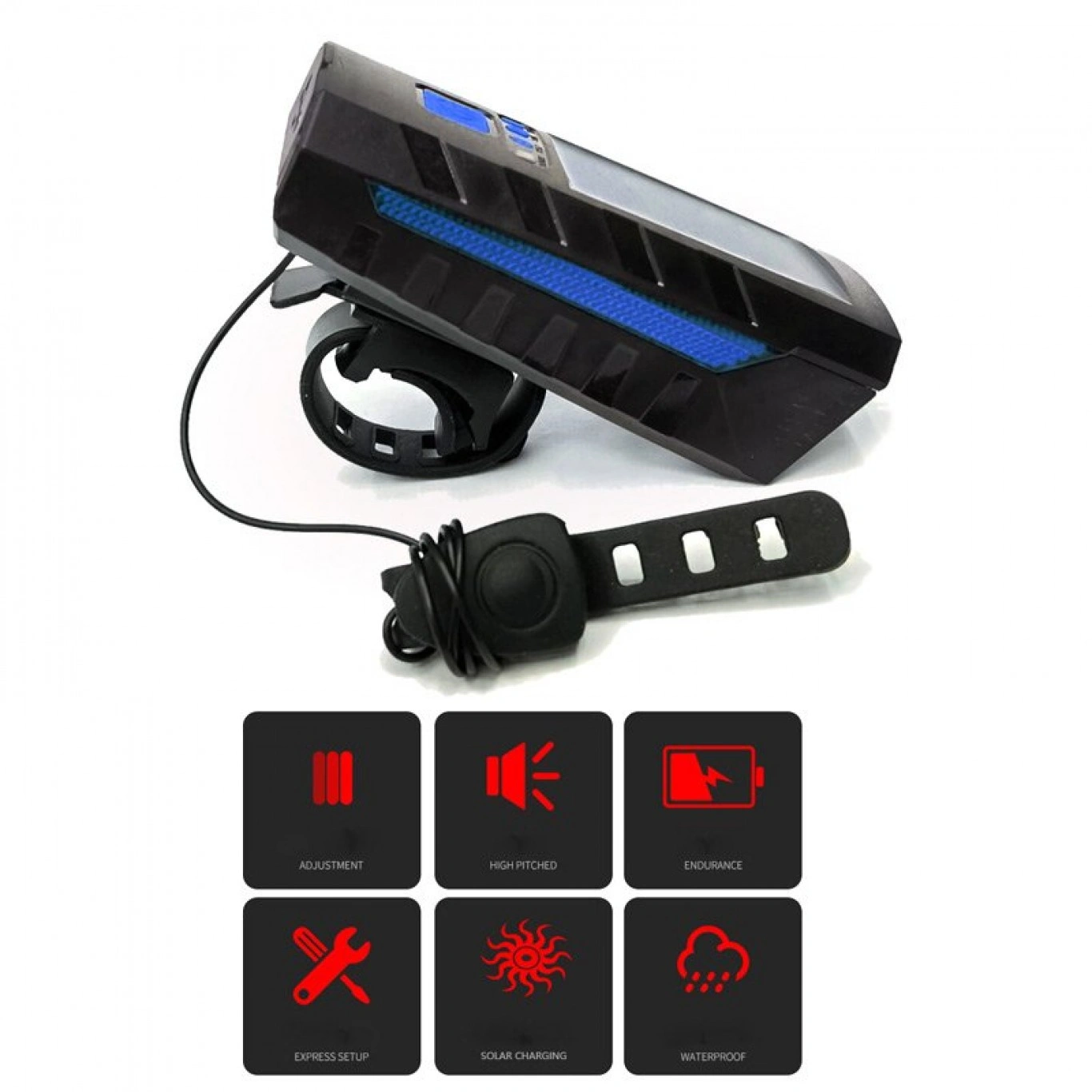 4-1 Φακός Πορείας LED, Κόρνα Ποδηλάτου, Φορτιστής Smartphones & Δυνατότητα Φόρτισης μέσω Ηλιακού Πάνελ ή μέσω Καλωδίου USB με 3 Λειτουργίες Φωτισμού