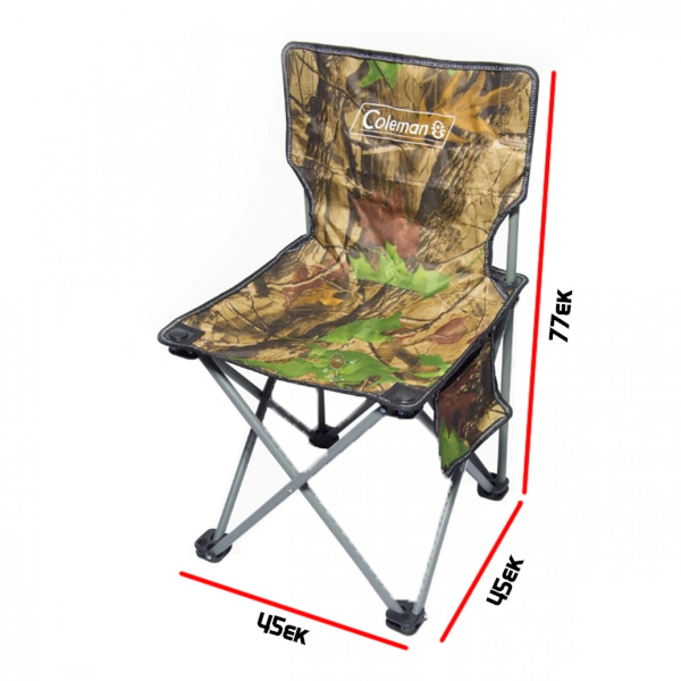Ελαφρύ, αναδιπλούμενο καρεκλάκι ύψους 77 εκατοστών σε χρώμα παραλλαγής με αποθηκευτική θήκη – τσέπη, ιδανικό για το κυνήγι ή το ψάρεμα.
