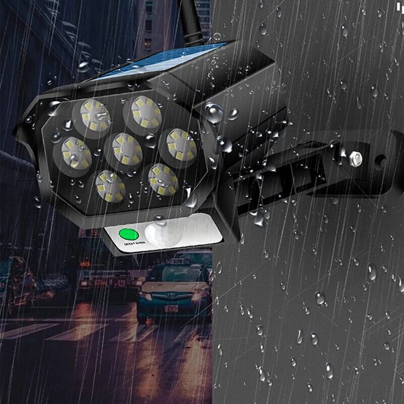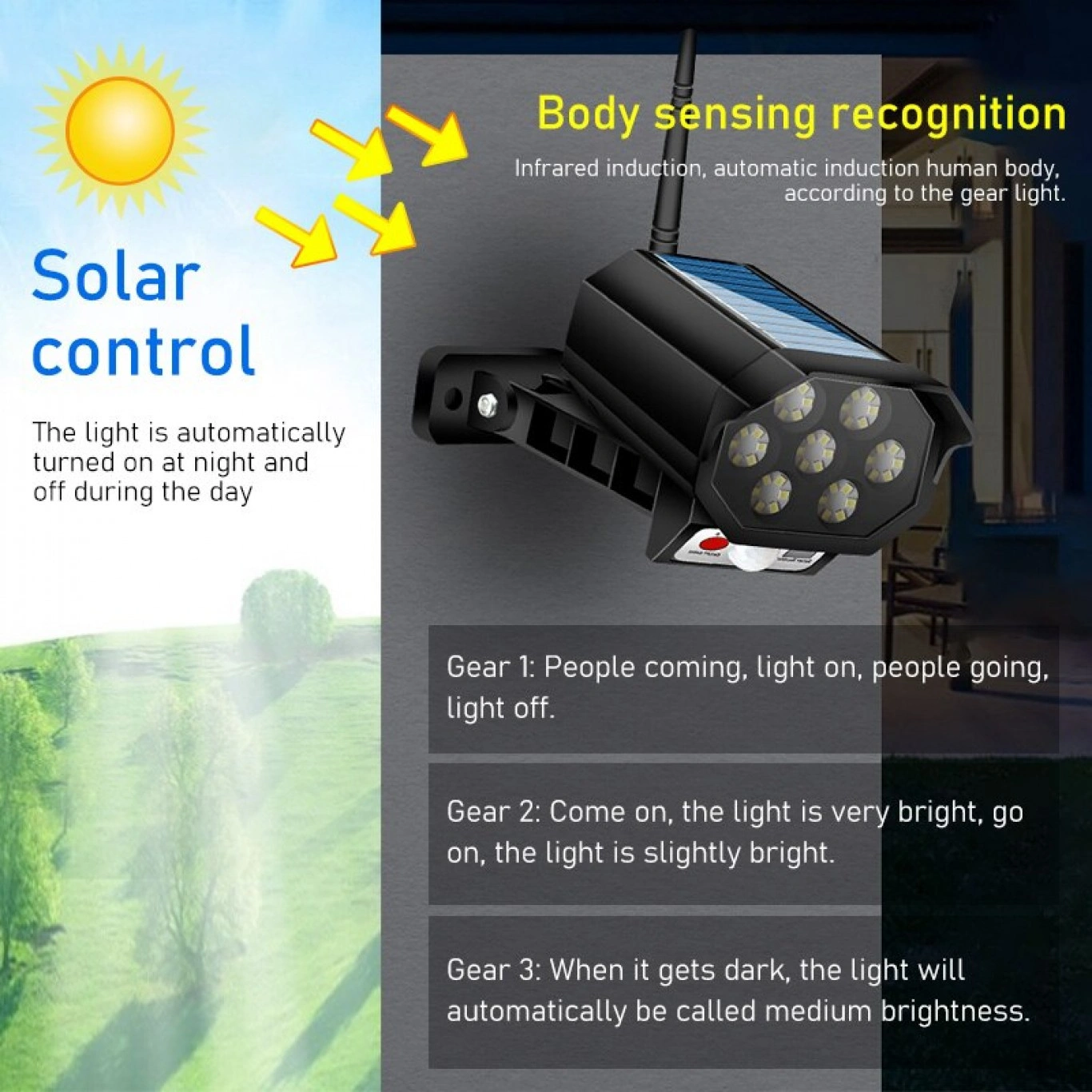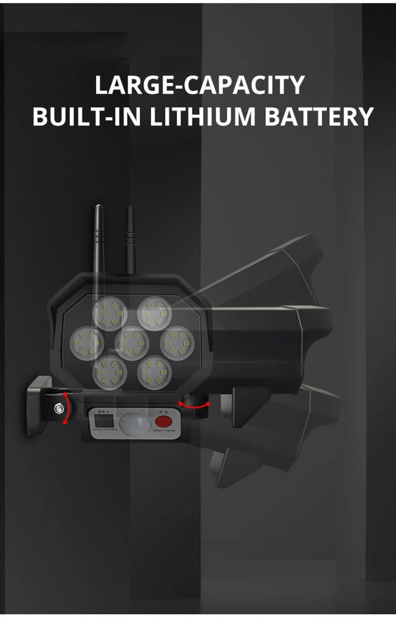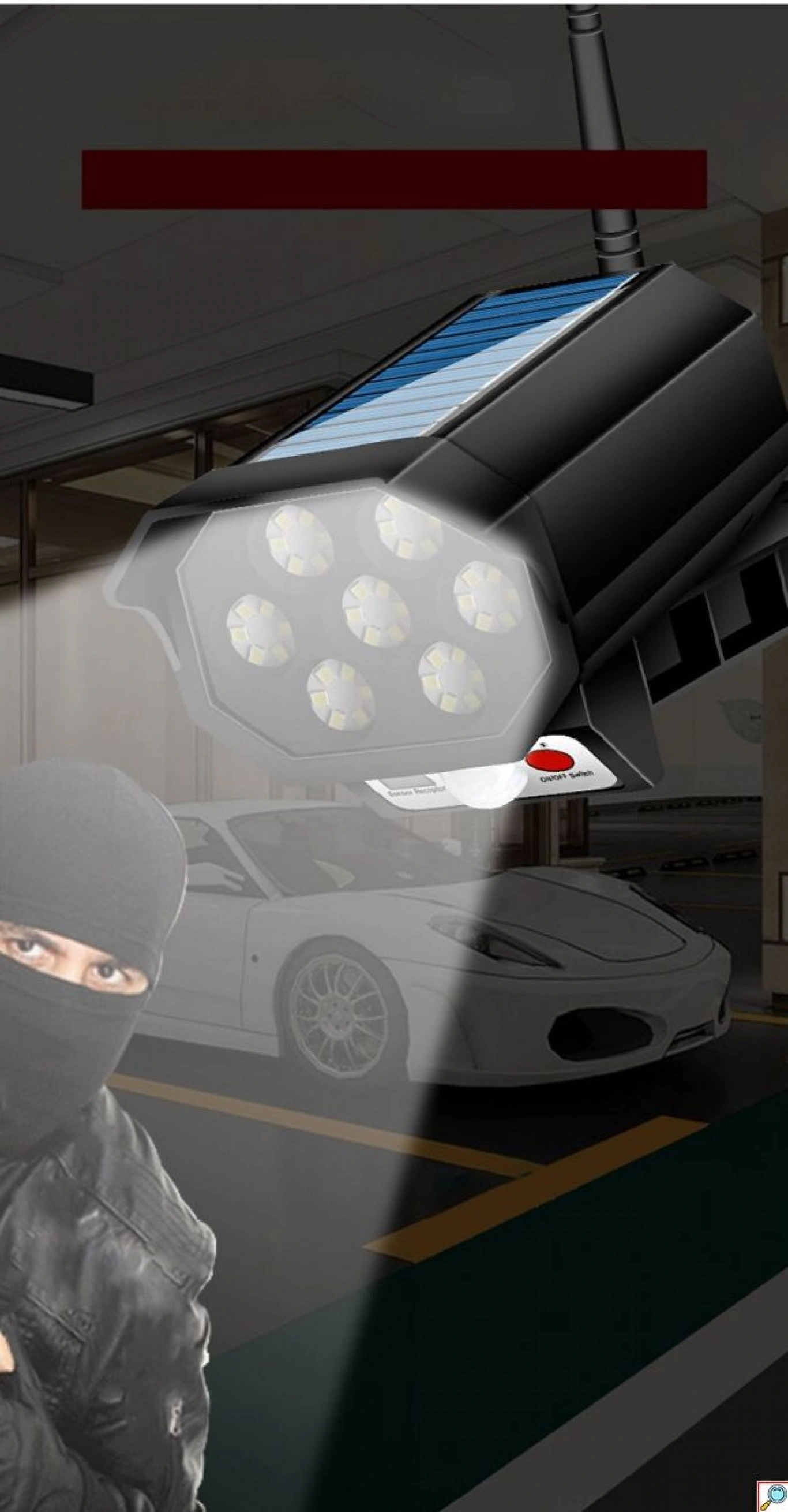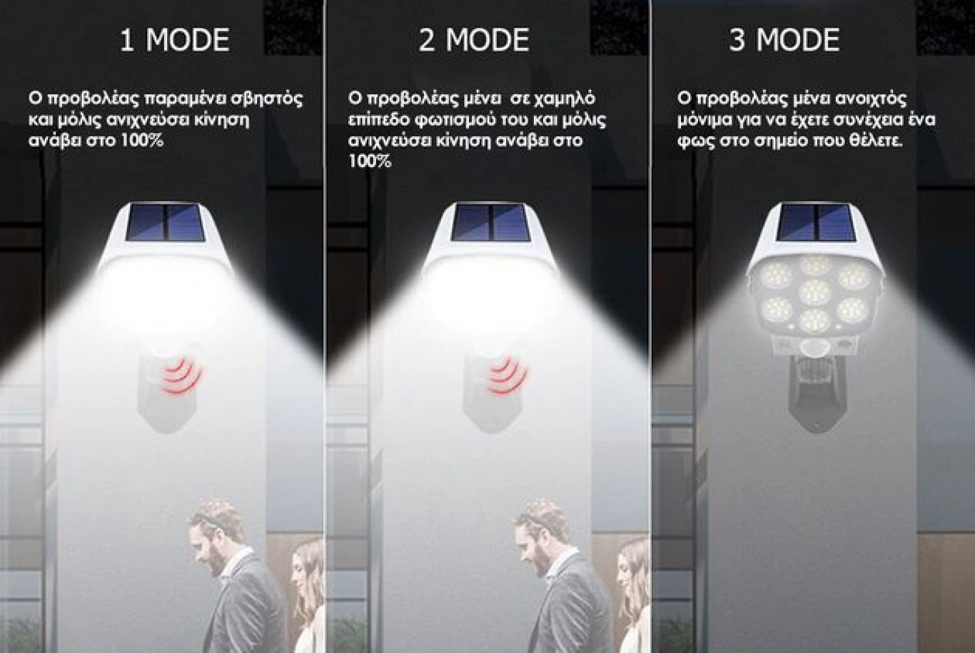 Ένα αδιάβροχο σετ με 4 τεμάχια ηλιακό φωτιστικό δρόμου με ομοίωμα κάμερας ασφαλείας & LED προβολέα , κατάλληλο για την αυλή ή την είσοδο του σπιτιού, πάρκινγκ, μαρίνες, σκάφη, τροχόσπιτα, εξοχικές κατοικίες, κήπους και αυλές, σκοτεινά στενά και άλλους εξωτερικούς ή εσωτερικούς χώρους χωρίς ηλεκτρικό ρεύμα.✔️ Νέας γενιάς λαμπτήρες LED. ✔️ Υψηλή φωτεινότητα με χαμηλή κατανάλωση.✔️ Διαθέτει dummy κεραία και κόκκινο φωτάκι που ανάβει περιοδικά, δίνοντας την εντύπωση της καταγραφής.✔️ 3 Working Modes, PIR & Night Sensor.✔️ IP65 Water- & Dustproof.✔️ Μεγάλη αντοχή στις καιρικές συνθήκες. ✔️ Εγγύηση μεγάλης διάρκειας ζωής και άριστης λειτουργίας.✔️ Μεγάλη χωρητικότητα μπαταρίας.✔️ Ηλιακό πάνελ.