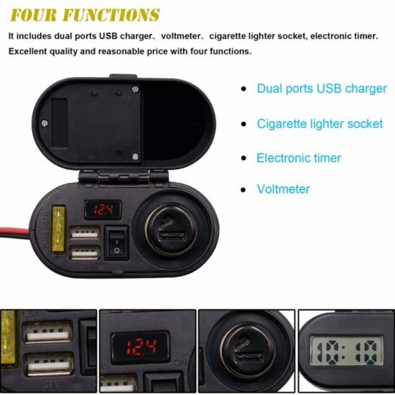 Αδιάβροχος φορτιστής πολλαπλών λειτουργιών με αναπτήρα αυτοκινήτου, 2 θύρες USB, ηλεκτρονικό ρολόι και βολτόμετρο για να έχετε όλα τα απαραίτητα πάνω στη μηχανή σας!