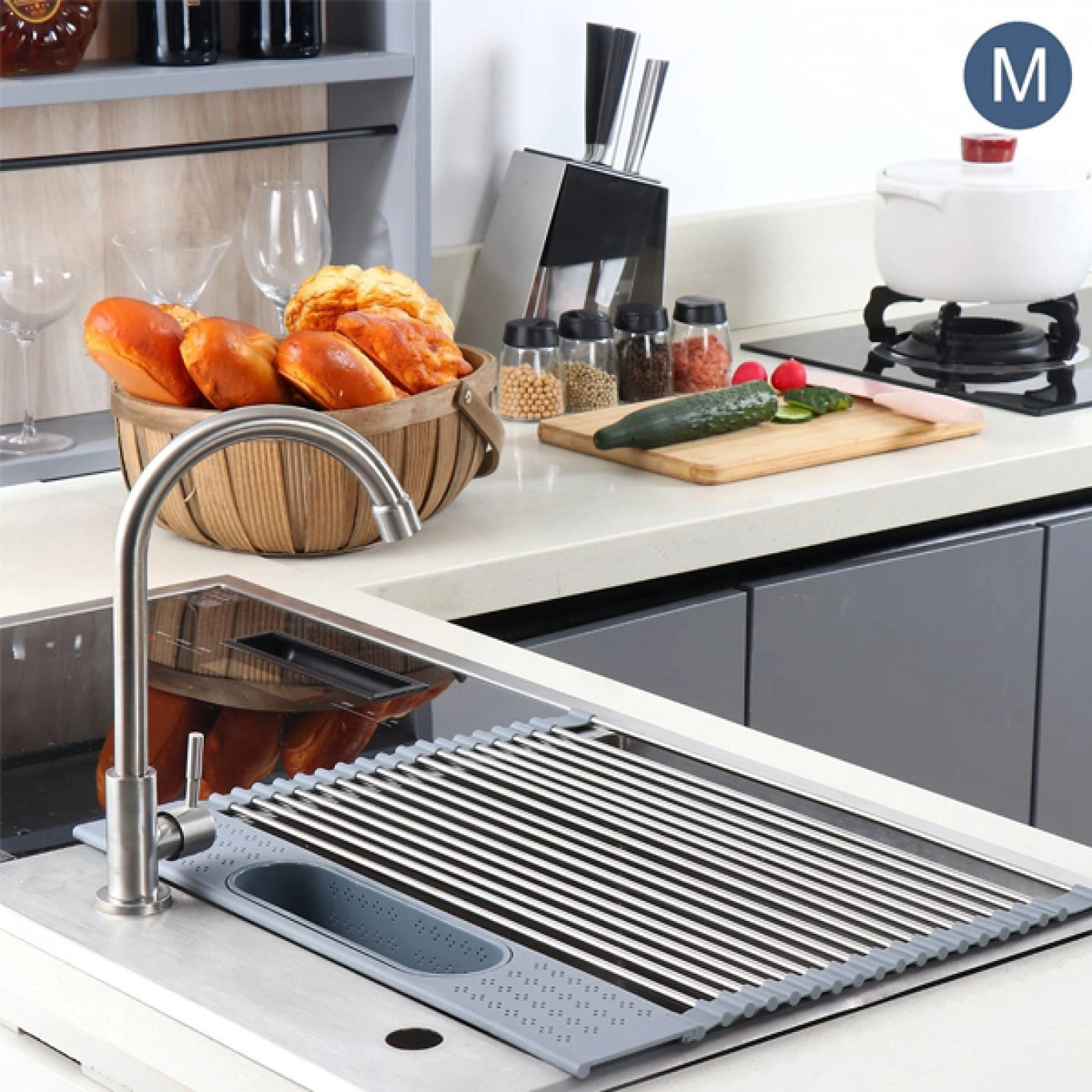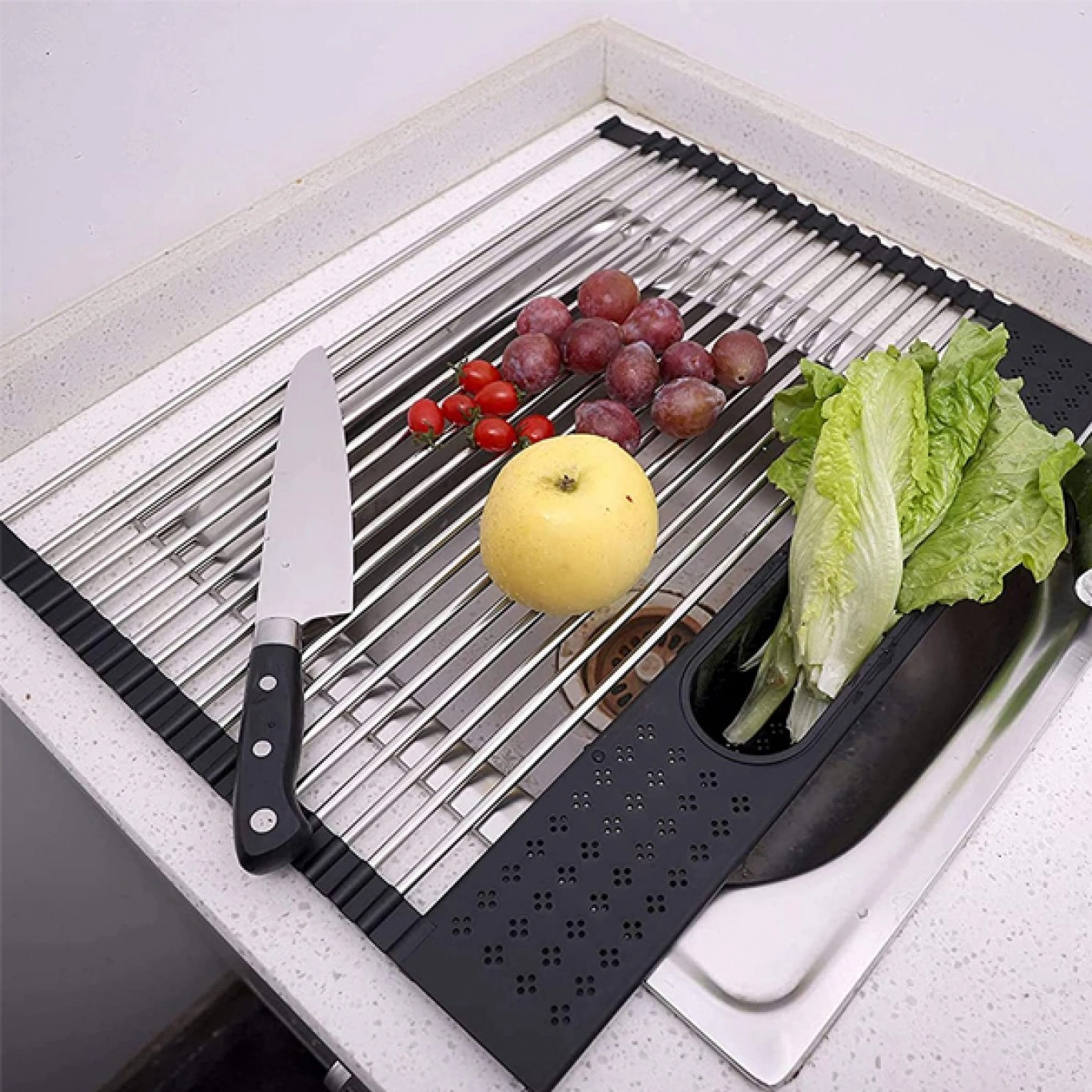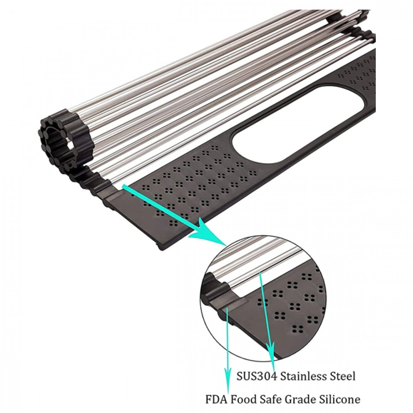 Ένας καλός βοηθός για μια τακτοποιημένη κουζίνα. Αυτή η σχάρα αποστράγγισης είναι κατασκευασμένη από ανοξείδωτο χάλυβα διαθέτει και επίστρωση σιλικόνης. Είναι ισχυρή, άκαμπτη, ανθεκτική στη σκουριά, αντιολισθητική, ασφαλής, αδιάβροχη, ανθεκτική στο λάδι και καθαρίζεται εύκολα. Μπορεί επίσης να χρησιμοποιηθεί ως στραγγιστικό για πιάτα ,μπολ, ποτήρια, τηγάνια, φλιτζάνια. Όταν δεν χρησιμοποιείται, είναι εύκολο να τοποθετηθεί, να καθαριστεί ή να τυλιχτεί σε ρολό και να αποθηκεύετει στην ντουλάπα, εξοικονομώντας χώρο στον πάγκο. Εχει αντοχή στη θερμότητα έως 287 ° C.