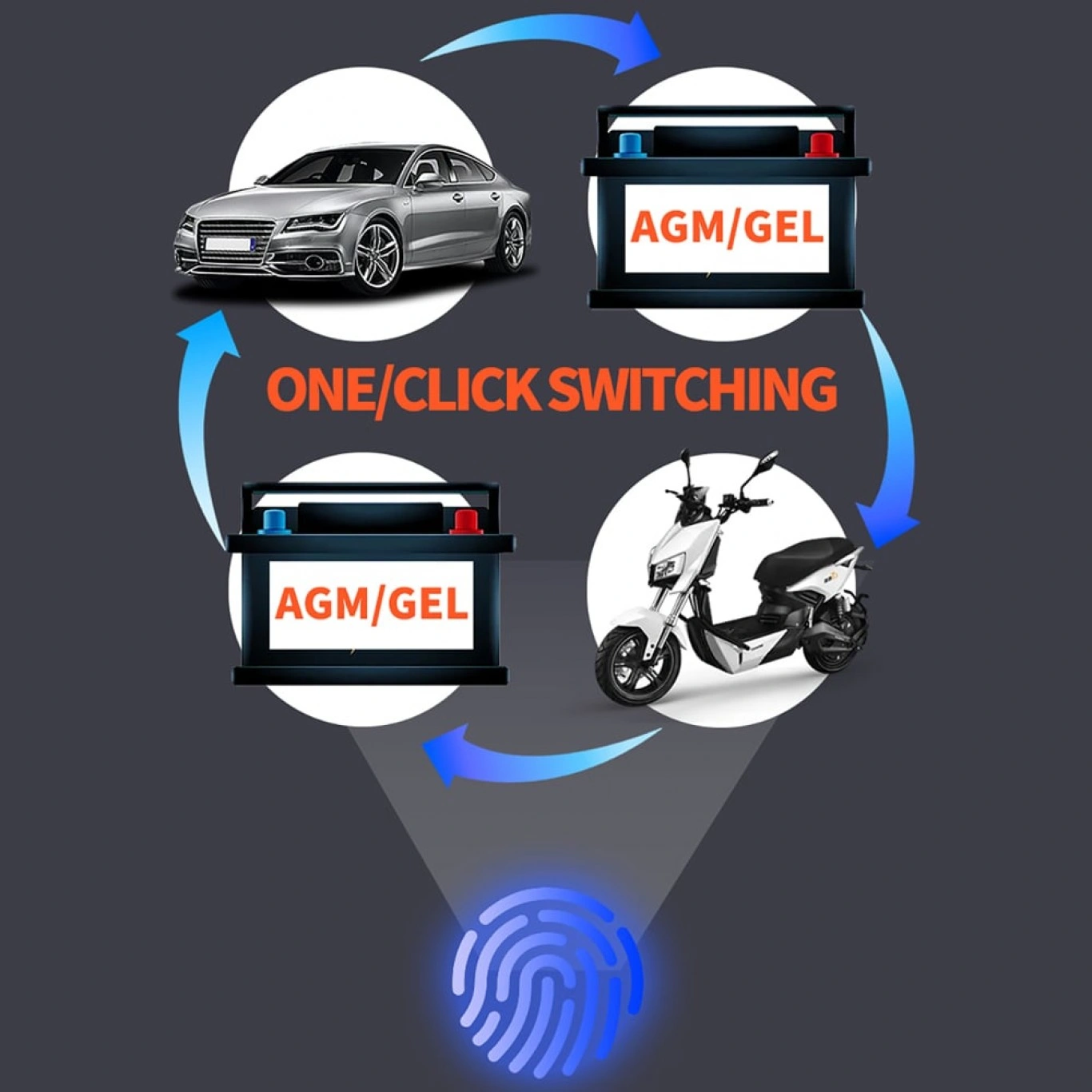 Ένα παλμικός φορτιστής μπαταρίας αυτοκινήτων, εξοπλισμένος με οθόνη LCD κατάλληλος για αυτοκίνητα , μοτοσυκλέτες, σκάφη και άλλα.