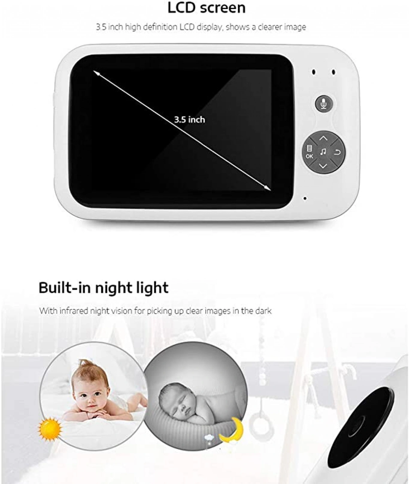 Λειτουργία ανίχνευσης θερμοκρασίας και οθόνη σε πραγματικό χρόνο στην οθόνη LCD για να διατηρείτε το περιβάλλον άνετο και να παρέχει στο μωρό ένα ευχάριστο περιβάλλον ύπνου. Με τον αισθητήρα θερμοκρασίας, παρακολουθήστε τη θερμοκρασία του δωματίου του μωρού όλη την ημέρα και βοηθάτε στη φροντίδα της υγείας του.