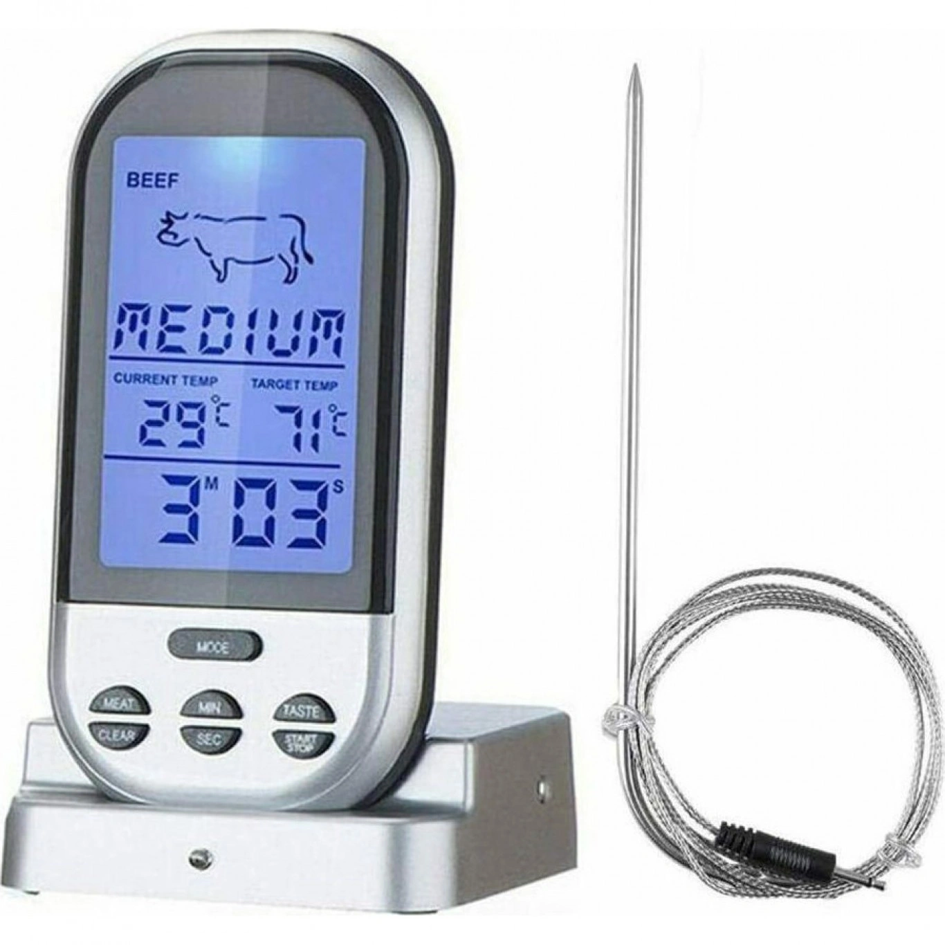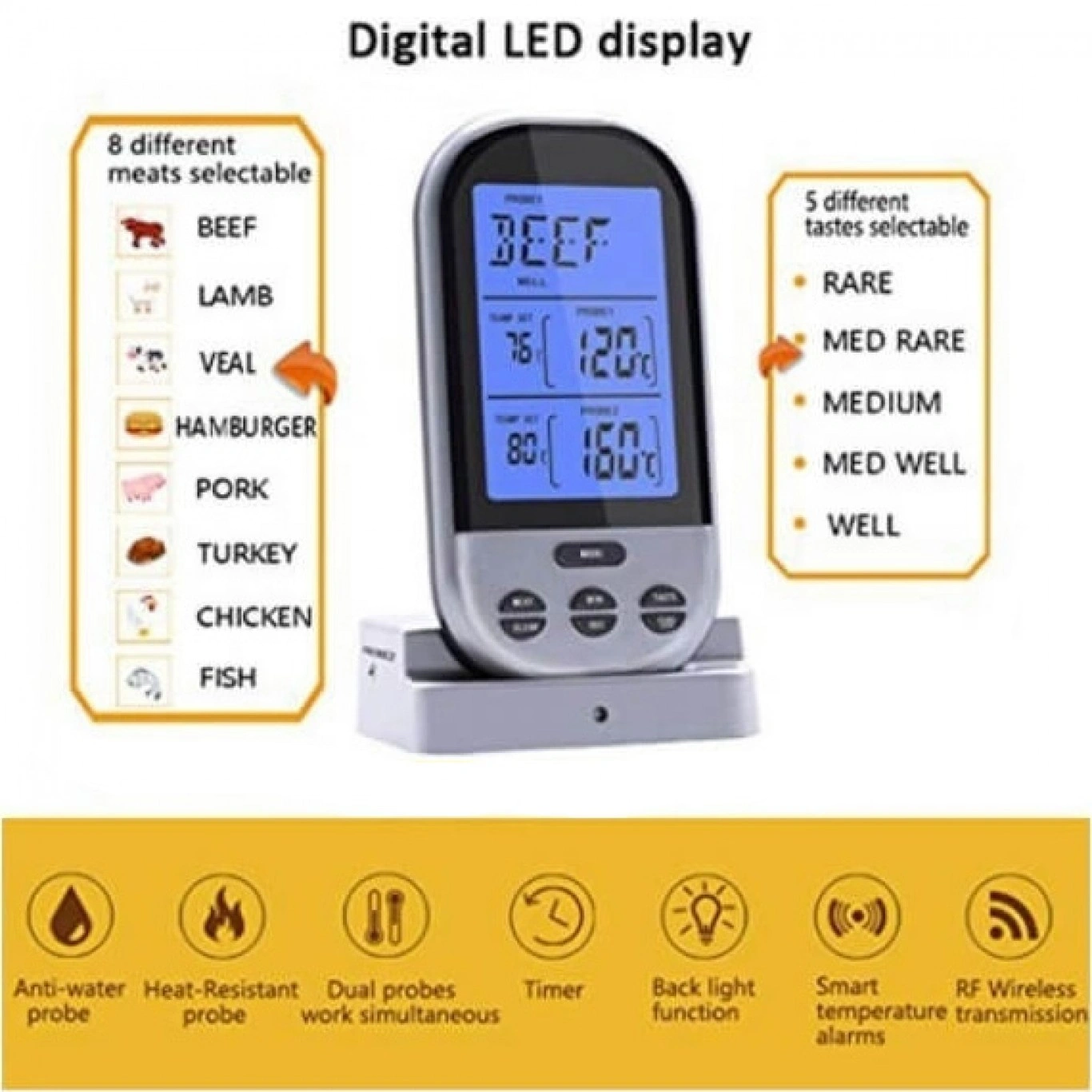Καινοτόμο, ασύρματο ψηφιακό θερμόμετρο μαγειρικής, όπου έχει έρθει να σας λύσει τα χέρια!Όχι μόνο είναι σχεδιασμένο με Premium διπλούς ανιχνευτές IPX7 και μεγάλη οθόνη LCD με οπίσθιο φωτισμό, αλλά χρειάζεται μόνο 1-2 δευτερόλεπτα για τη μέτρηση της ακριβούς θερμοκρασίας έως και 300°C.Μπορεί επίσης να παρακολουθεί την θερμοκρασία του κρέατος στο φούρνο, την ψησταριά ή το καπνιστήριο από 30 μέτρα μακριά, δίνοντάς σας την ελευθερία να κάνετε ό,τι θέλετε κατά τη διάρκεια του μαγειρέματος!✔️Διαθέτει προκαθορισμένη θερμοκρασία για 8 είδη κρέατος (βόειο κρέας, αρνί, μοσχάρι, χάμπουργκερ, χοιρινό, γαλοπούλα, κοτόπουλο, ψάρι) και 5 επίπεδα ετοιμότητας κρέατος που συνιστάται από το USDA, ώστε να μπορείτε να προσαρμόσετε τη θερμοκρασία και χρονοδιακόπτη για να ταιριάζει στην προσωπική σας προτίμηση!✔️Είναι εξοπλισμένο επίσης με ειδοποίηση συναγερμού για προγραμματισμένη θερμοκρασία ή χρονοδιακόπτη, έτσι ώστε να μην κάψετε το κρέας σας. Η κύρια μονάδα έχει μεγάλη οθόνη LCD και λειτουργεί με 2 μπαταρίες ΑΑ (δεν περιλαμβάνονται) και ο ασύρματος δέκτης λειτουργεί με 2 μπαταρίες ΑΑΑ (δεν περιλαμβάνονται).✔️Με διαβαθμίσεις σε Φαρενάιτ και Κελσίου για να διαλέξετε ό,τι σας βολεύει.Ο καθαρισμός της ακίδας γίνεται με σφουγγάρι και απορρυπαντικό πιάτων. Όχι σε πλυντήριο πιάτων.