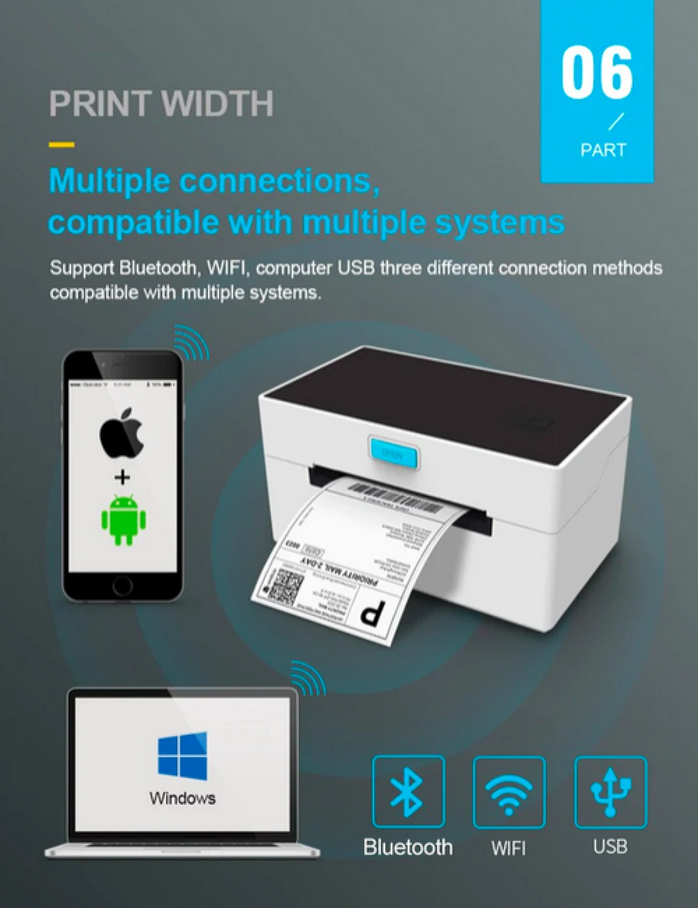 Τύπος : Θερμικός Θύρες : USB, LAN Ασύρματη σύνδεση Bluetooth Εντολή εκτύπωσης : TSPL (CPCL/ESC/POS συμβατό) Ταχύτητα εκτύπωσης : 160mm/s max Αισθητήρας πολυμέσων : Transmissive and reflective Υποστήριξη κατεβάσματος και εκτύπωσης λογοτύπου Υποστήριξη γραμματοσειρών : ASCII, GB18030, BIG5 Οδηγός : 1D (UPC-A, UPC-E, EAN13, EAN8, CODE39, ITF, CODABAR, CODE93, CODE128 / 2D (QR CODE, PDF417) Τάση/ρεύμα : 24V / 2.5A TPH : περίπου 50km ή 100 εκατομύρια παλμούς Χαρτί : συνεχόμενο, ετικέτας, διπλωμένο, tag Μέγεθος ρολό : 110x100mm Μήκος εκτύπωσης : 104mm Πάχος χαρτιού : 0.06-0.30mm Διαστάσεις : 20×11.5x11cm Βάρος : 1kg Θερμοκρασία λειτουργίας : 0ºC ∼ 50ºC Θόρυβος : ≤ 60dB Χρώμα : ΛευκόΣτη συσκευασία θα βρείτε τα εξής : 1 x Ασύρματος θερμικός εκτυπωτής 1 x Eξωτερική βάση για ρολό 1 x Kαλώδιο USB 1 x Kαλώδιο τροφοδοσίας 1 x Eγχειρίδιο χρήσης