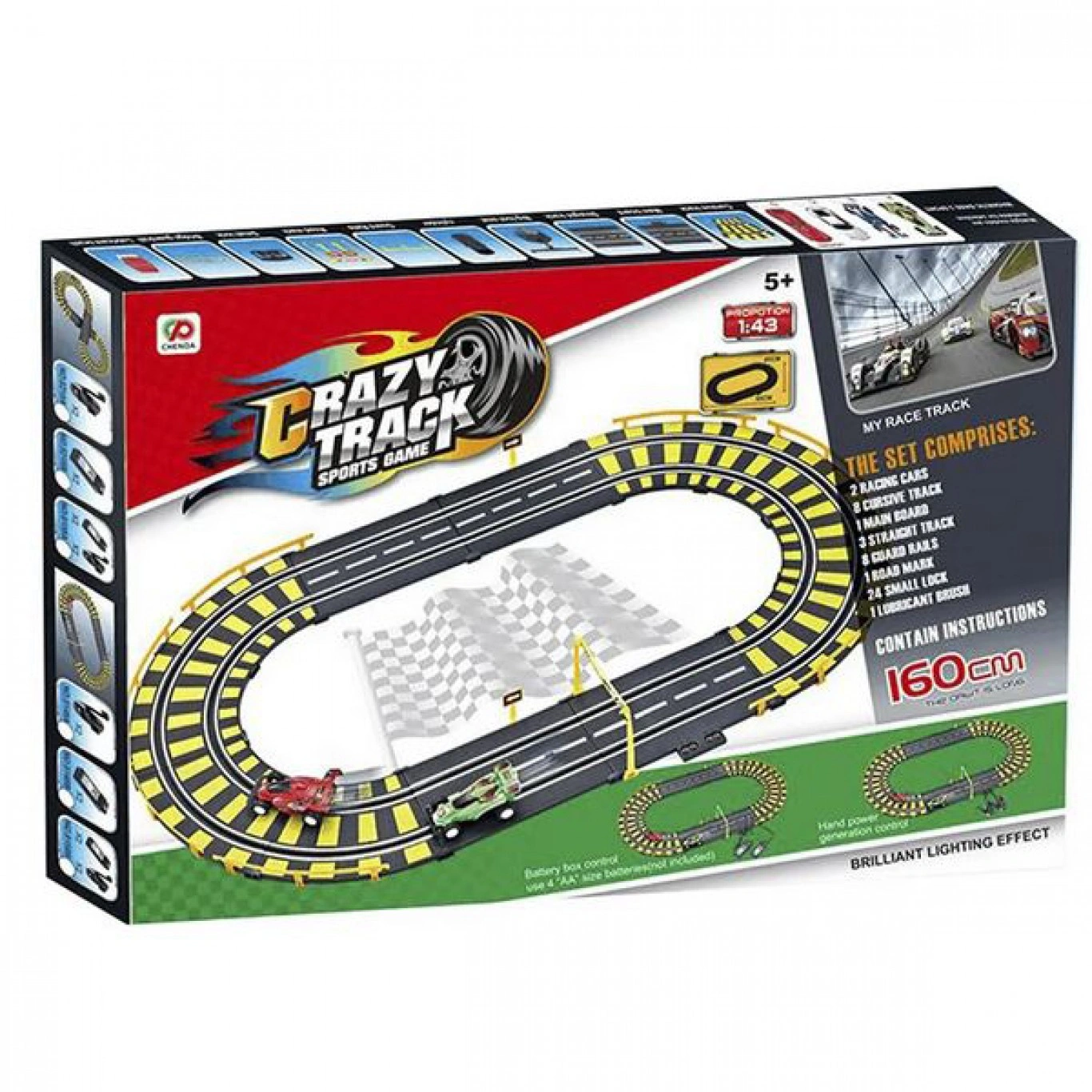 Ο αυτοκινητόδρομος μπαταρίας Crazy Tracks διαθέτει πίστα μήκους 160 εκατοστών και Δυο Αγωνιστικά Αυτοκίνητα σε Κλίμακα 1:43 .