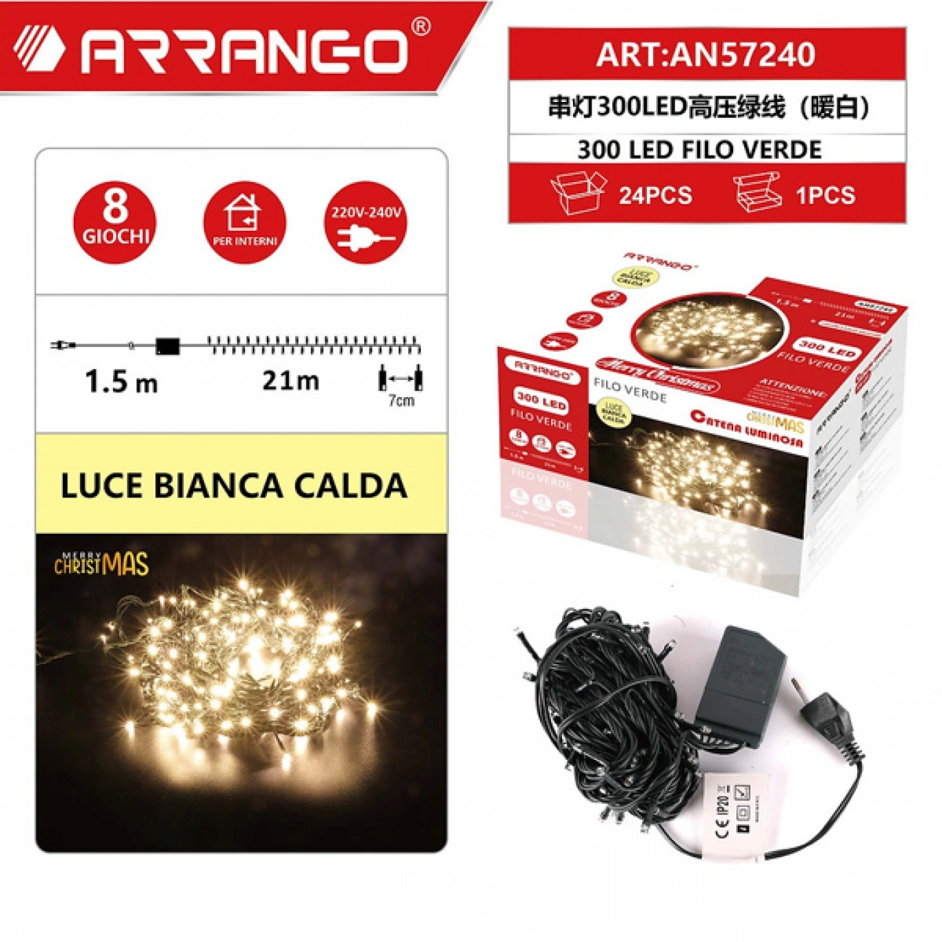 Χριστουγεννιάτικα λαμπάκια σειρά της Arrango μήκους 22.5m, με 300 λαμπάκια led. Έχουν πράσινο καλώδιο και εκπέμπουν θερμό λευκό φως, το οποίο αποδίδεται στην κλίμακα Kelvin με τιμές από 2400Κ έως 3800Κ. Οι τόνοι του θερμού λευκού είναι πιο κίτρινοι σε σχέση με το φυσικό φως. Λειτουργούν με ρεύμα.