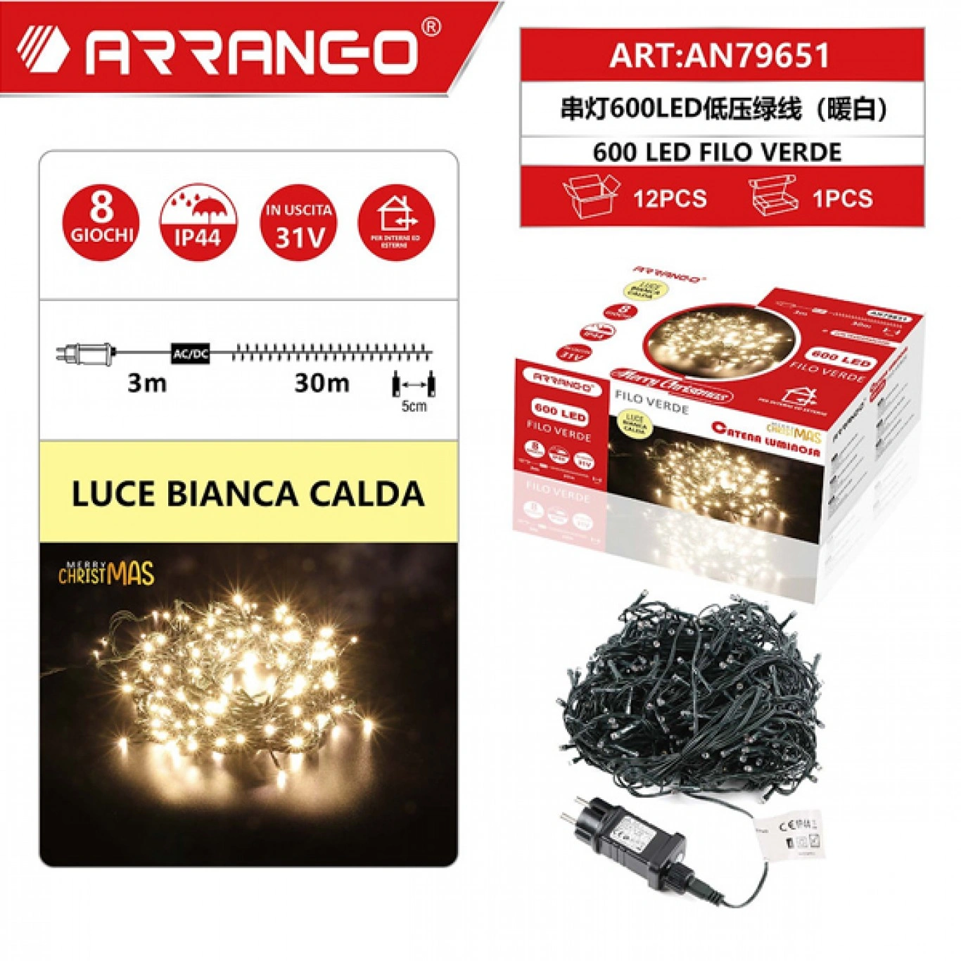 Χριστουγεννιάτικα λαμπάκια σειρά της Arrango μήκους 33m, με 600 λαμπάκια led. Έχουν πράσινο καλώδιο και εκπέμπουν θερμό λευκό φως, το οποίο αποδίδεται στην κλίμακα Kelvin με τιμές από 2400Κ έως 3800Κ. Οι τόνοι του θερμού λευκού είναι πιο κίτρινοι σε σχέση με το φυσικό φως. Λειτουργούν με ρεύμα.