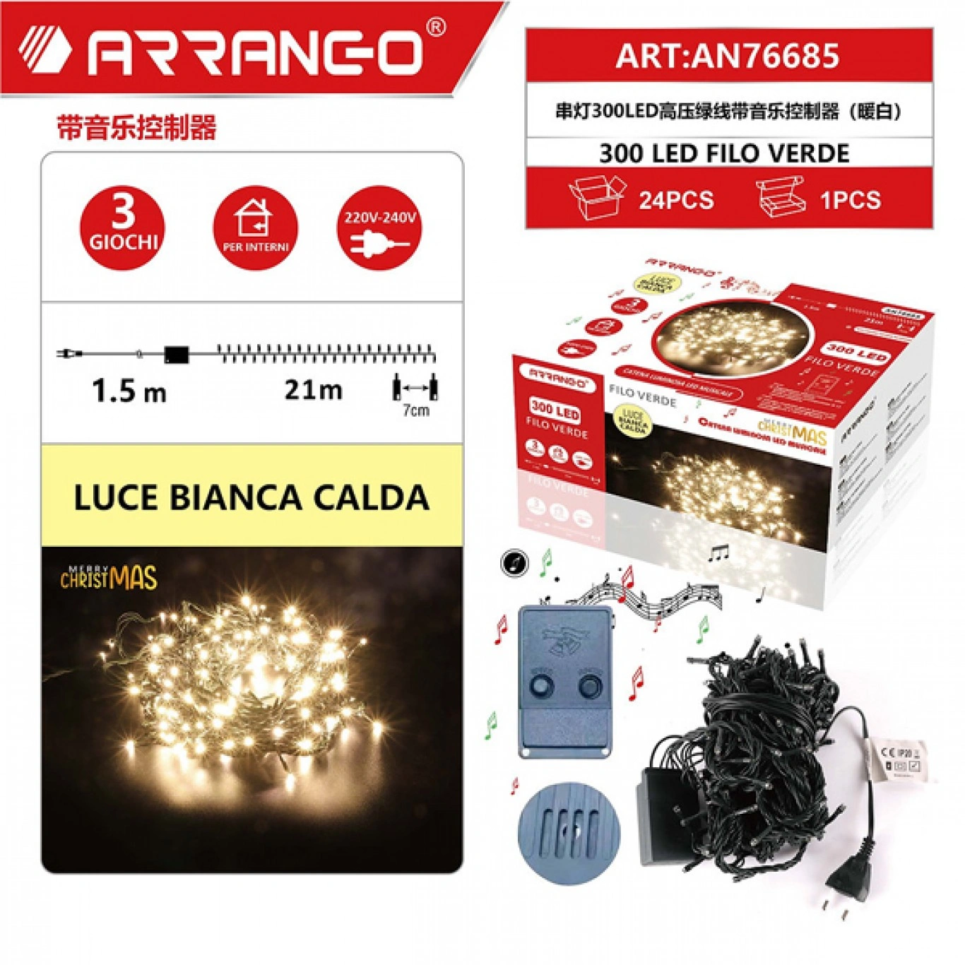 Χριστουγεννιάτικα λαμπάκια σειρά της Arrango μήκους 22.5m, με 300 λαμπάκια led. Έχουν πράσινο καλώδιο και εκπέμπουν θερμό λευκό φως, το οποίο αποδίδεται στην κλίμακα Kelvin με τιμές από 2400Κ έως 3800Κ. Οι τόνοι του θερμού λευκού είναι πιο κίτρινοι σε σχέση με το φυσικό φως. Έχουν τη δυνατότητα να παίζουν μουσική. Λειτουργούν με ρεύμα.