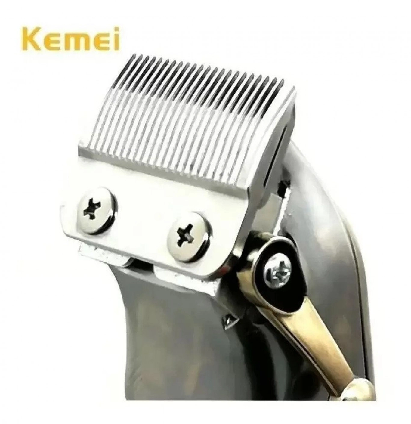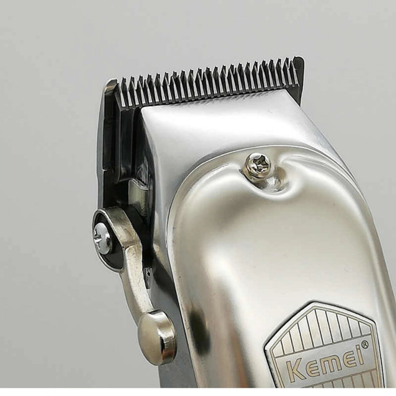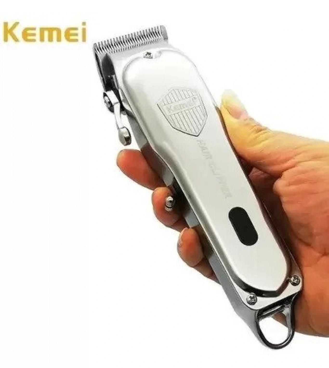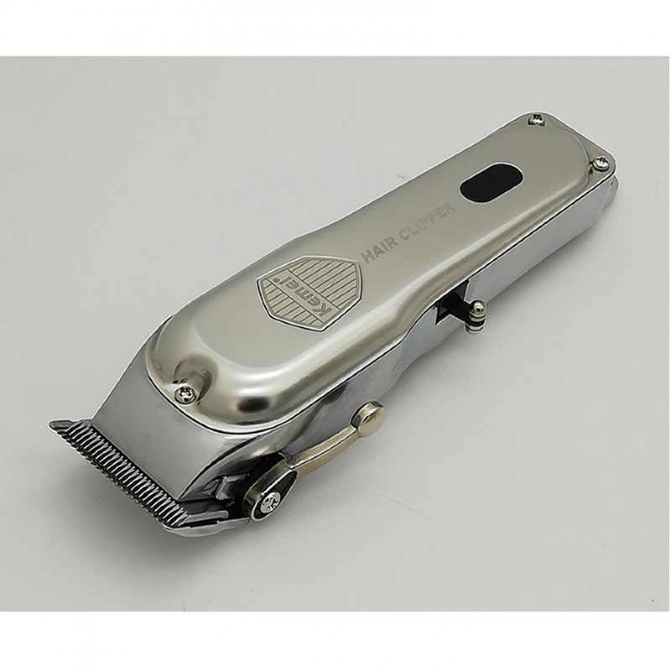 Eπαναφορτιζόμενη Μεταλλική Κουρευτική Μηχανή Kemei με κεφαλή από ανοξείδωτο χάλυβα, μοτέρ υψηλής ροπής, αθόρυβη λειτουργία, τεχνολογία κοπής για να μην τραυματίζει το δέρμα και οθόνη LCD για ένδειξη μπαταρίας.