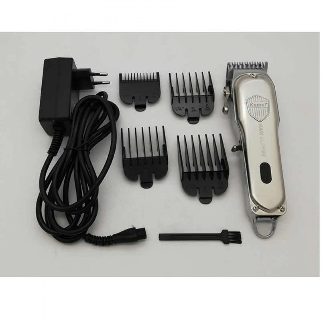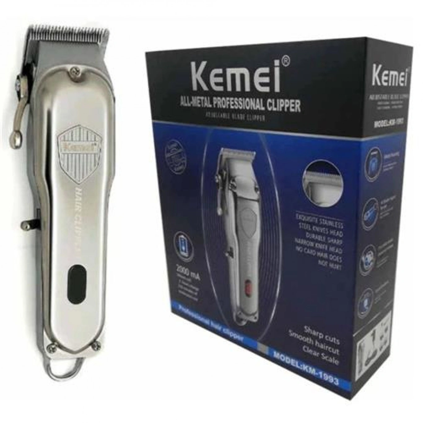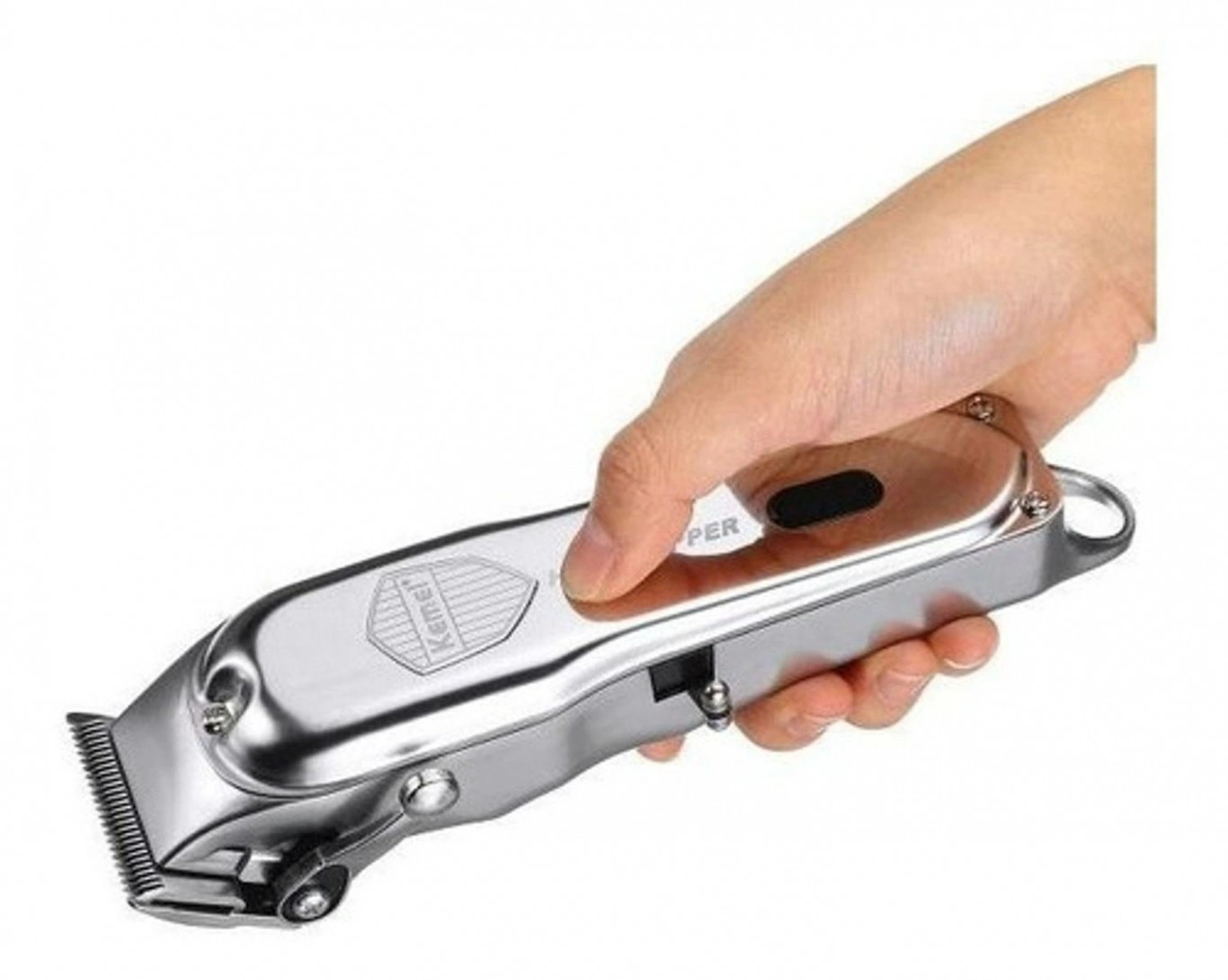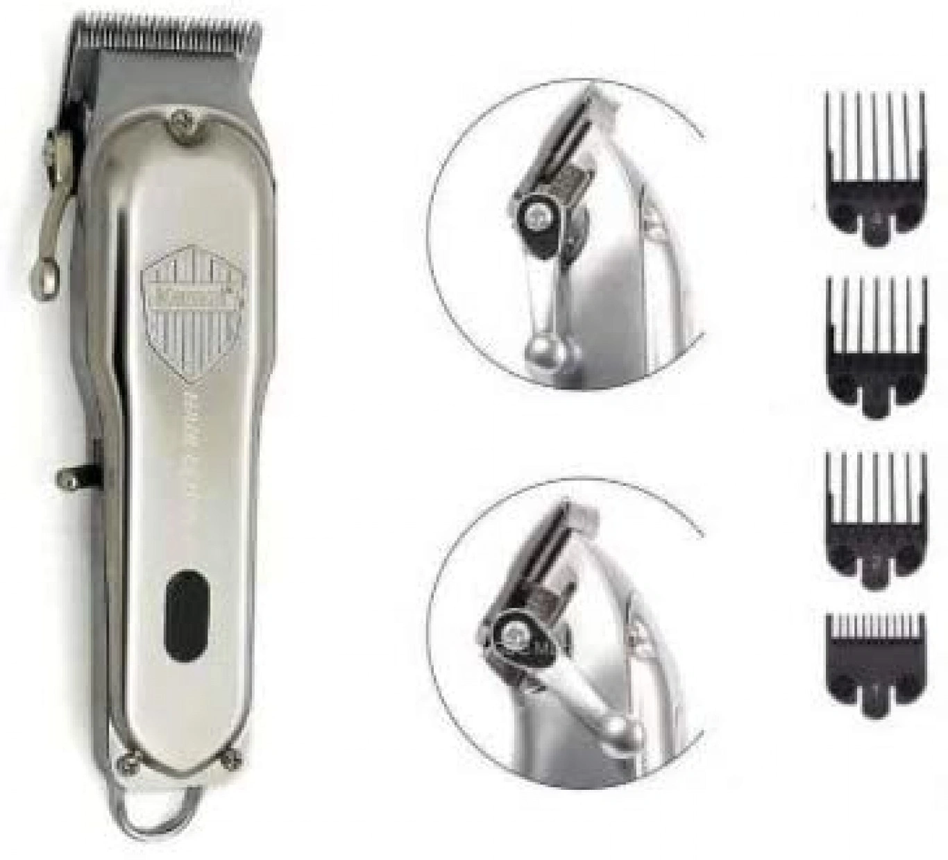 Eπαναφορτιζόμενη Μεταλλική Κουρευτική Μηχανή Kemei με κεφαλή από ανοξείδωτο χάλυβα, μοτέρ υψηλής ροπής, αθόρυβη λειτουργία, τεχνολογία κοπής για να μην τραυματίζει το δέρμα και οθόνη LCD για ένδειξη μπαταρίας.