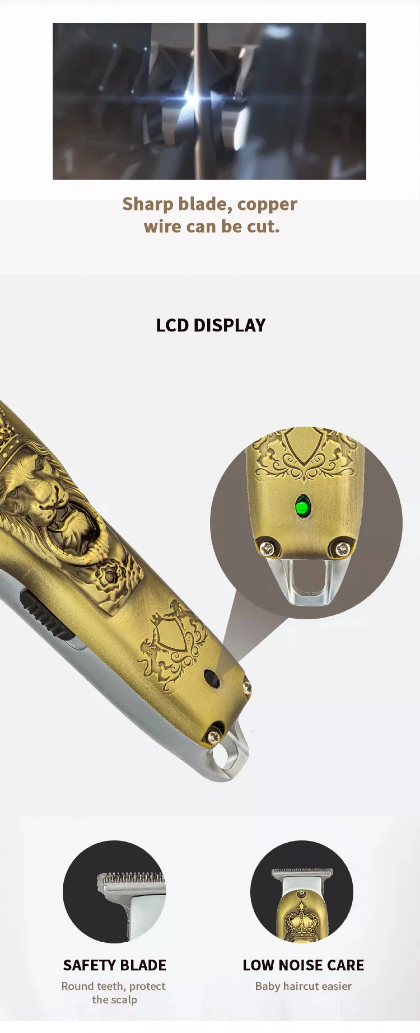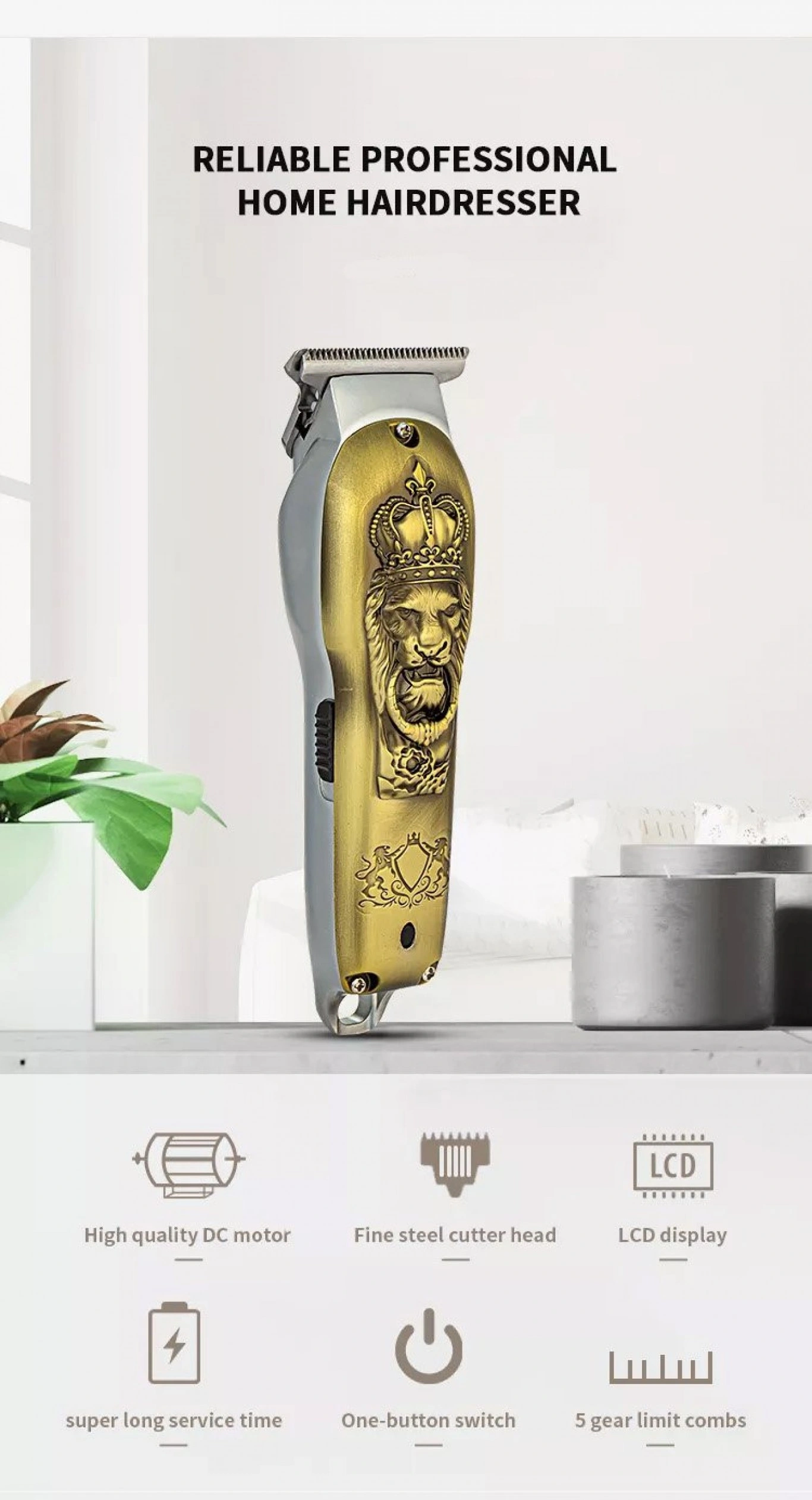 Επαγγελματική Κουρευτική Μηχανή 12W Επαναφορτιζόμενη Ρυθμιζόμενου Μήκους Κοπής με LCD Οθόνη – Χρυσή με Ανάγλυφο Λιοντάρι