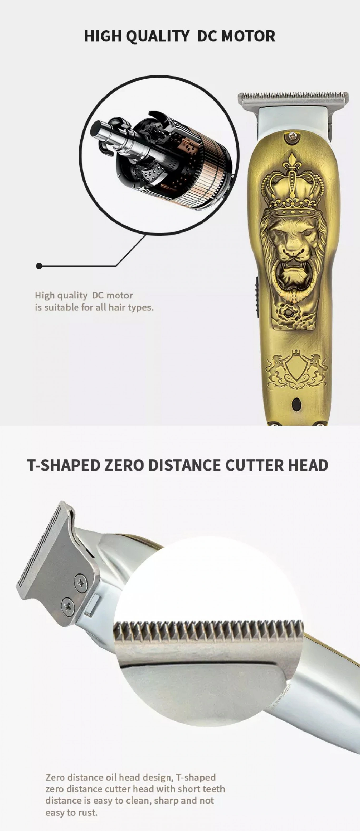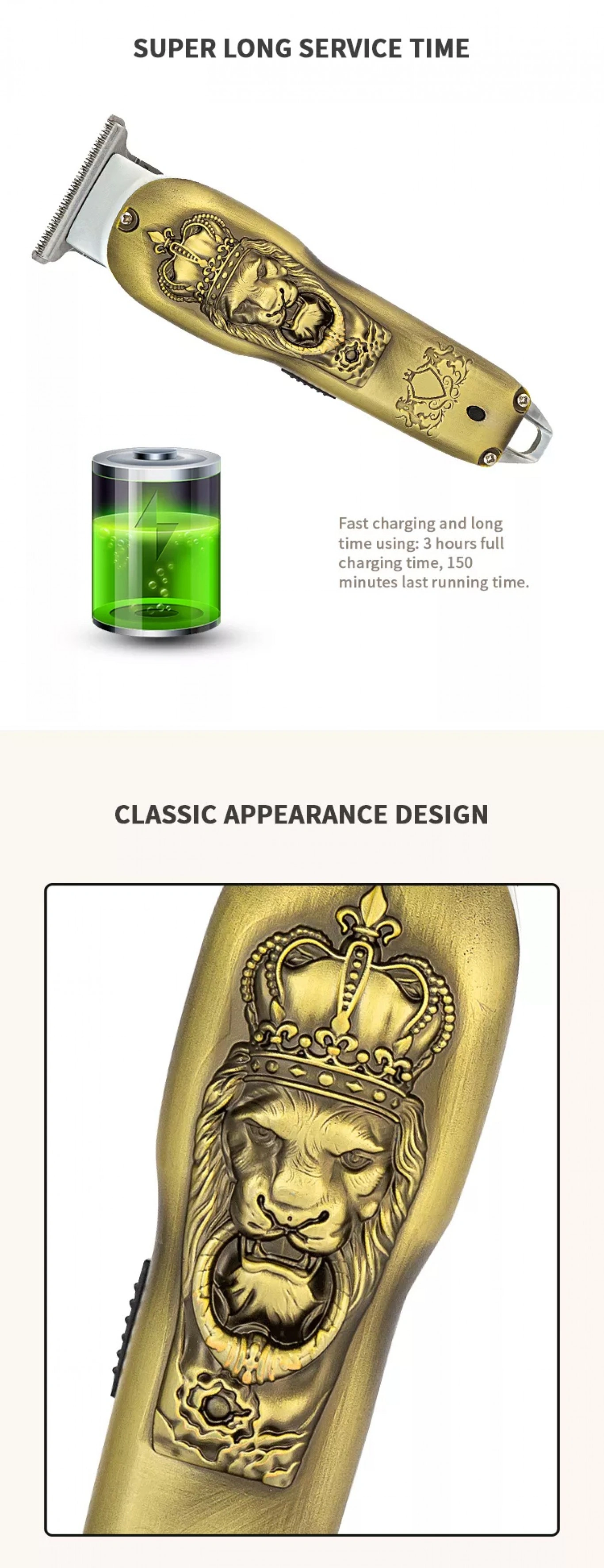 Μία εντυπωσιακή κουρευτική μηχανή με ιδιαίτερο ανάγλυφο σχέδιο, και αποτελέσματα επαγγελματικού επιπέδου.✔️ Ρυθμιζόμενο μήκος κοπής, για ξύρισμα και τριμάρισμα σώματος, μαλλιών και μούσια, με απόλυτη ακρίβεια και ασφάλεια.✔️ Φορτίζει γρήγορα και η μπαταρία έχει μεγάλη διάρκεια.✔️ Εξοπλισμένη με υψηλής ποιότητας λεπίδες που δεν σκουριάζουν.✔️ Πανέμορφος σχεδιασμός με ανάγλυφο λιοντάρι.