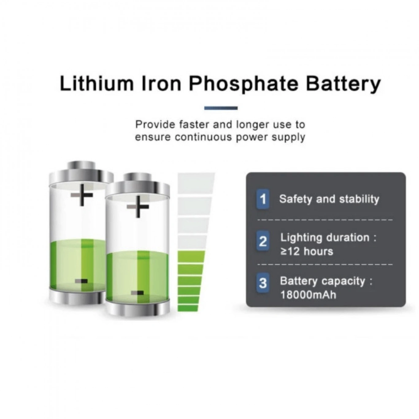 Κατά τη διάρκεια της ημέρας το ηλιακό πάνελ συλλέγει ενέργεια από τον ήλιο και αποθηκεύει την ισχύ στην προηγμένη μπαταρία λιθίου χωρητικότητας 18000mAh και διάρκεια λειτουργίας 10-12 ώρες.