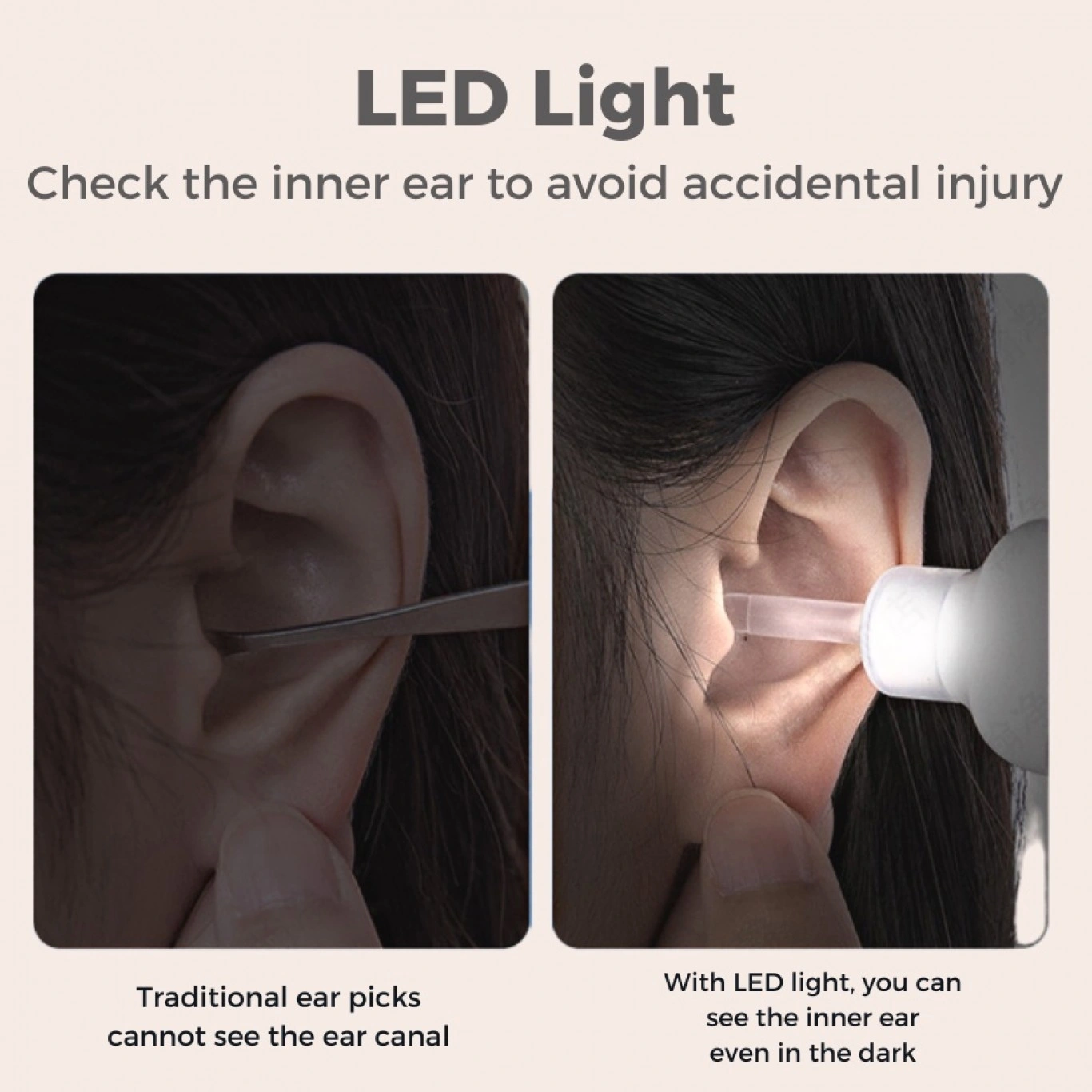 ✔️ Το ενσωματωμένο φως LED διευκολύνει τον έλεγχο της κατάστασης του εσωτερικού αυτιού κατά τον καθαρισμό, αποφεύγοντας να καταστραφεί ο ακουστικός πόρος από την έλλειψη φωτός.
