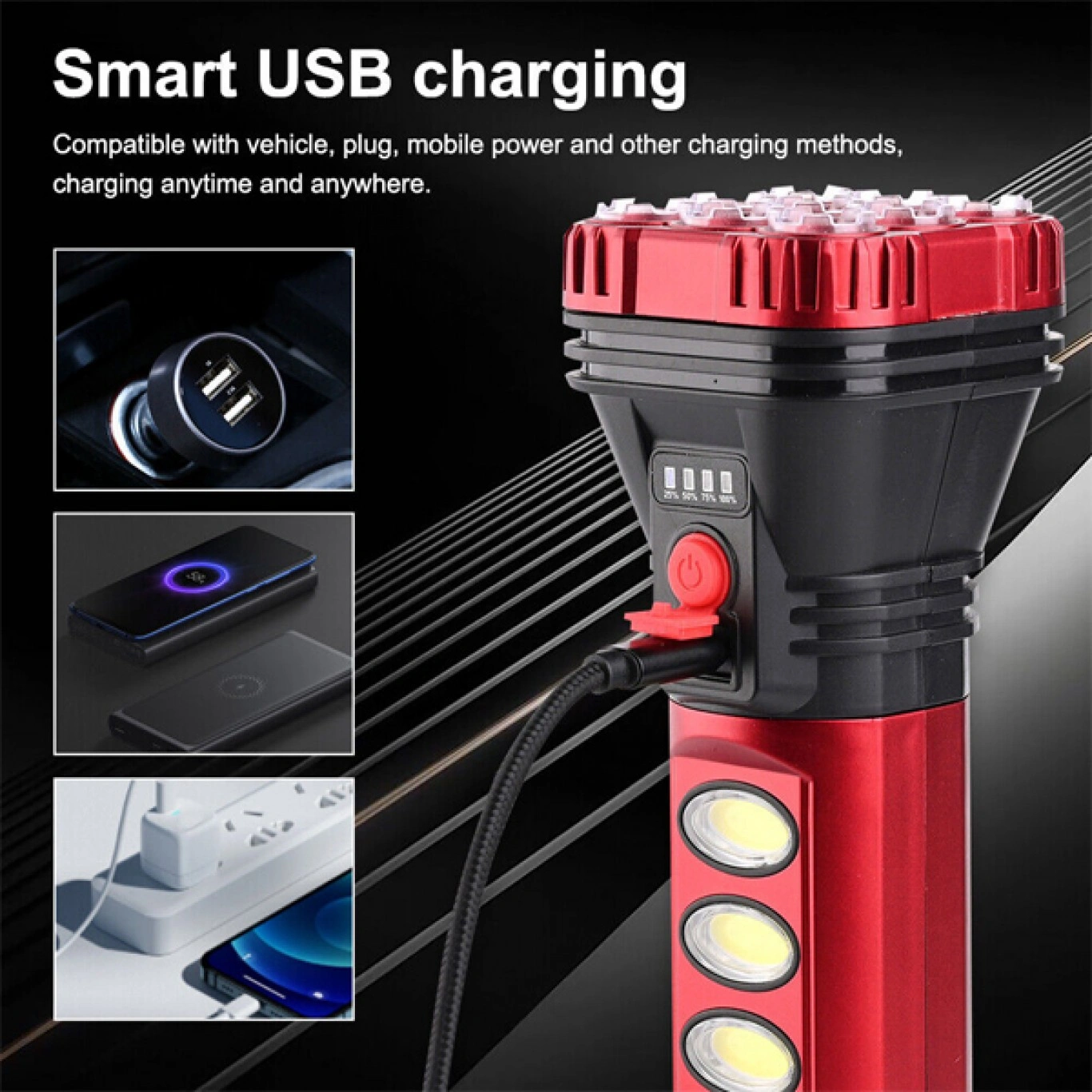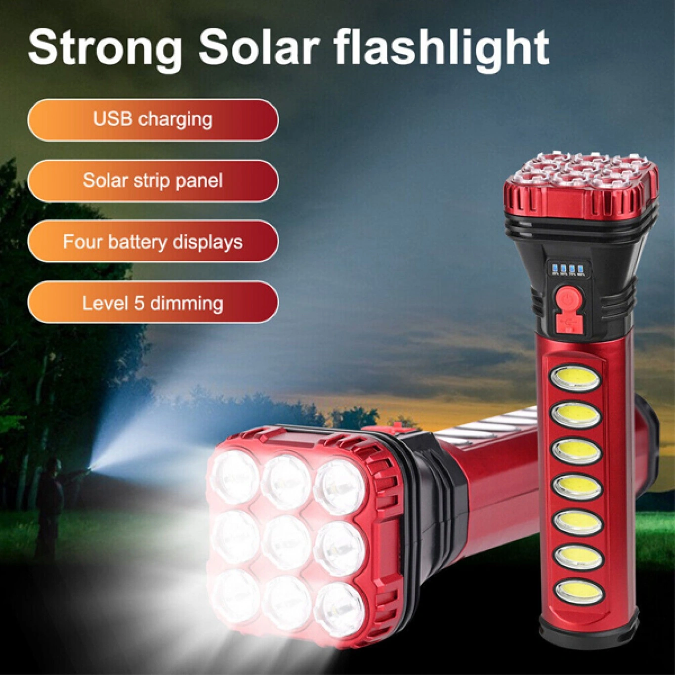 Φακός προβολέας LED κατάλληλος για χρήση σε εργοτάξια, σπίτι, αυτοκίνητο, εξοχή, κυνήγι, ψάρεμα και κάμπινγκ. Τροφοδοτείται με ηλιακή ενέργεια και μέσω της θύρας USB.