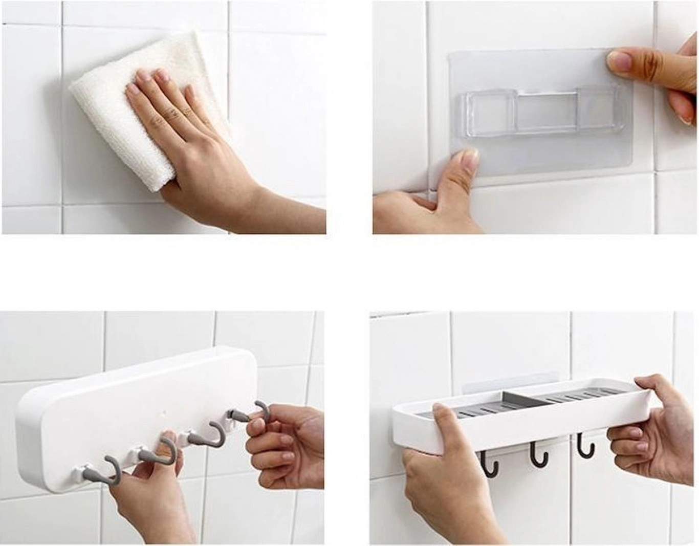 Επιτοίχιο Αυτοκόλλητο Ραφάκι για Σαπούνια Νιπτήρα Μπάνιου με 4 Γάντζους – Κρεμάστρες Πλαστικό