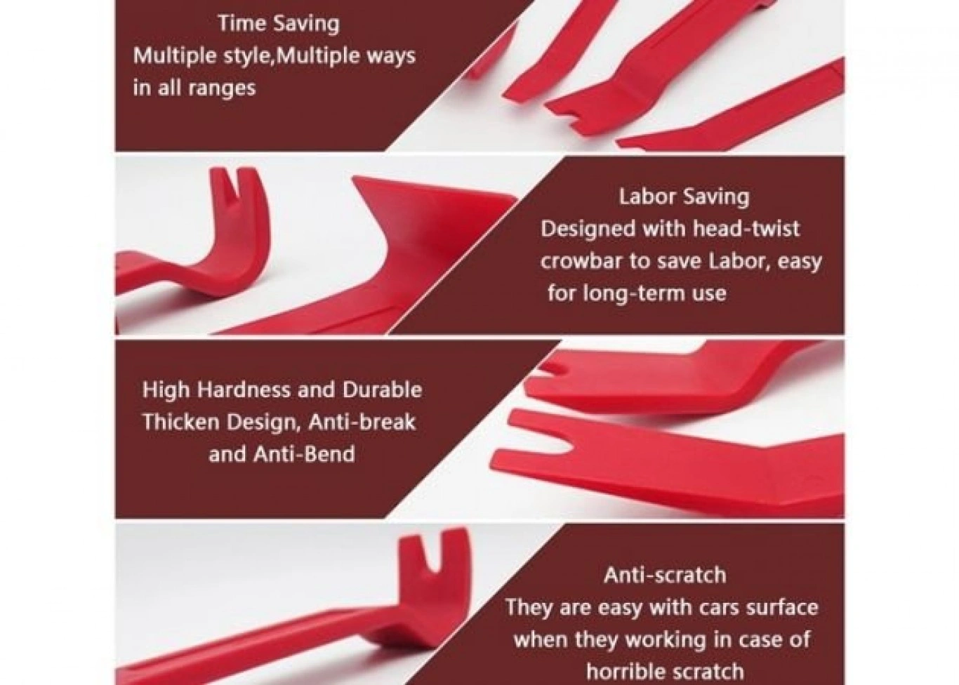 Το σετ αφαίρεσης πλαστικών ταμπλό αυτοκινήτου περιλαμβάνει όλα όσα χρειάζεστε για να αφαιρέσετε και να αποσυναρμολογήσετε διακοσμητικά πλαστικά, ταπετσαρίες, πλαστικά κλίπς, καλύμματα του αυτοκινήτου σας, πάνελ των θυρών, ηχεία, ράδιο – cd player, οθόνες, ταμπλό κλπ. Οι μοχλοί απομάκρυνσης τμημάτων είναι κατασκευασμένοι από πλαστικό ενισχυμένο με ίνες υάλου. Το σετ έρχεται σε τσάντα – θήκη μεταφοράς υψηλής ποιότητας. Ειδικό για επαγγελματίες, μάστορες, συνεργεία για επισκευές ηχητικών αυτοκινήτου και οτιδήποτε στο εσωτερικό και το ταμπλό.