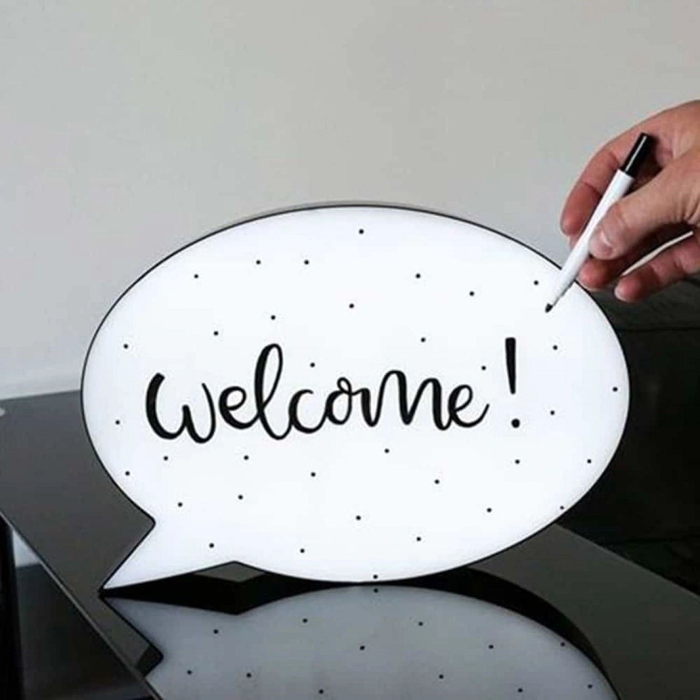 Πρόκειται για έναν φωτεινό πίνακα με σχέδιο φούσκας ομιλίας στην επιφάνεια του οποίου μπορείτε να σημειώσετε και σχεδιάσετε ότι επιθυμείτε και ότι η φαντασία σας σας επιτρέπει με έναν μαρκαδόρο για πίνακα (WhiteBoard Marker).
