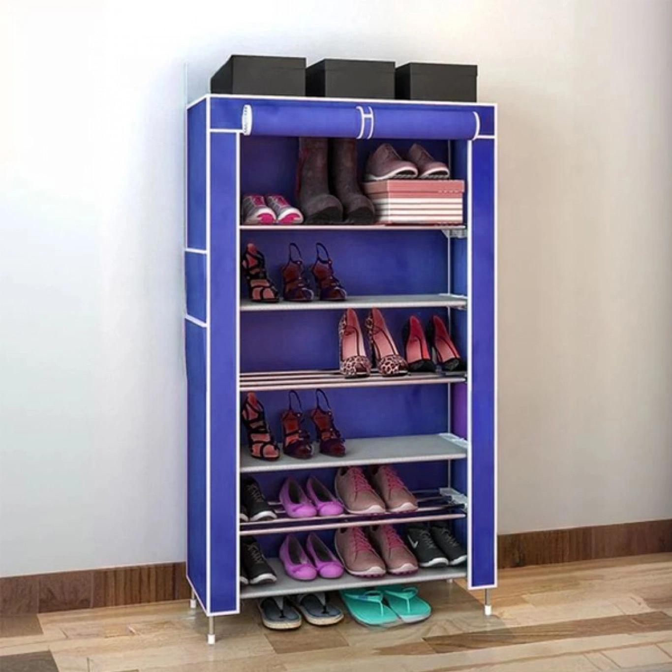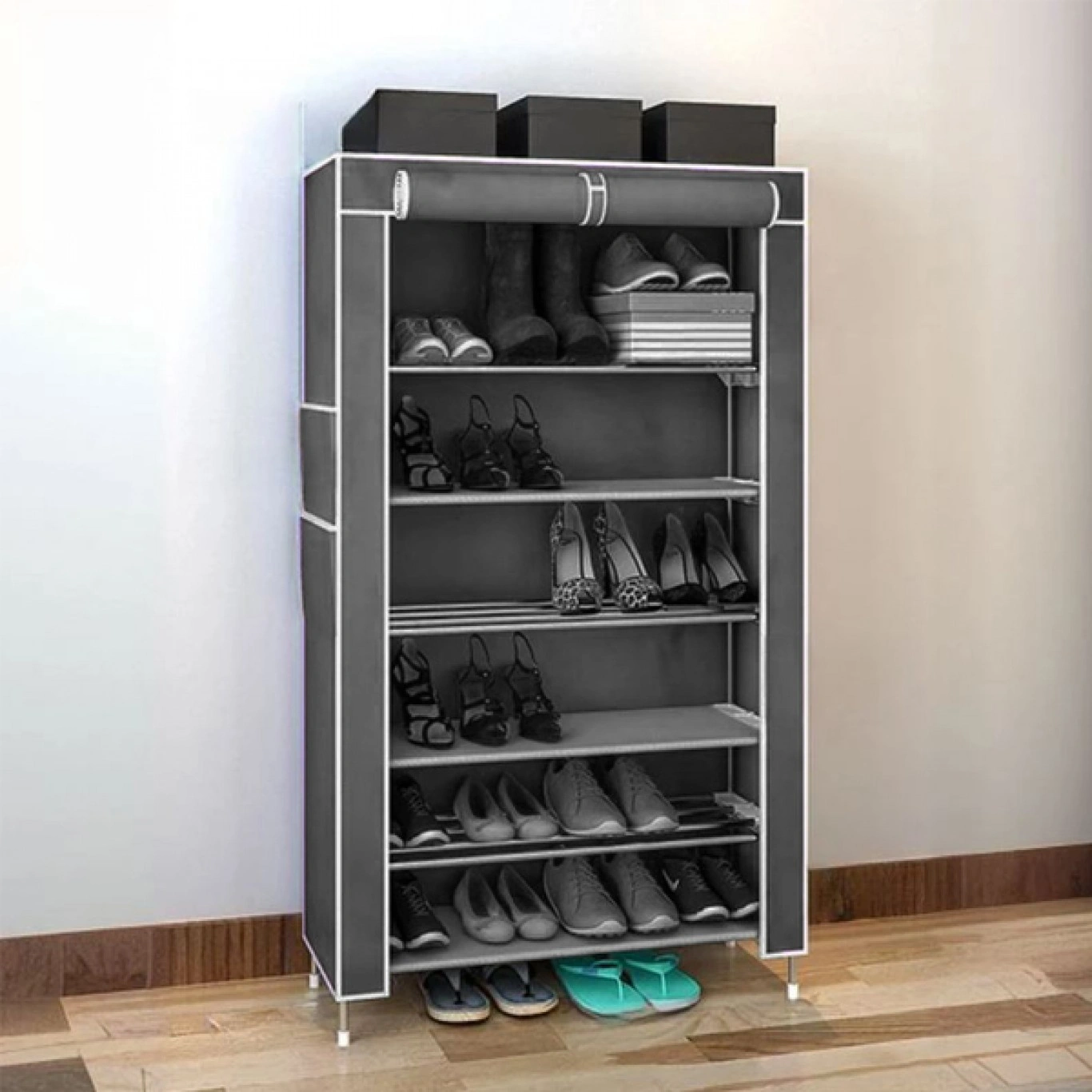 Φορητή υφασμάτινη παπουτσοθήκη με 6 ράφια και μεταλλικό σκελετό, σχεδιασμένη να προστατεύει τα ρούχα και τα παπούτσια σας από τη σκόνη και τις βρομιές. Είναι ιδανική για το σπίτι, το εξοχικό ή την αποθήκη. Διαθέτει ράφια που χωρούν ρούχα και λευκά είδη.