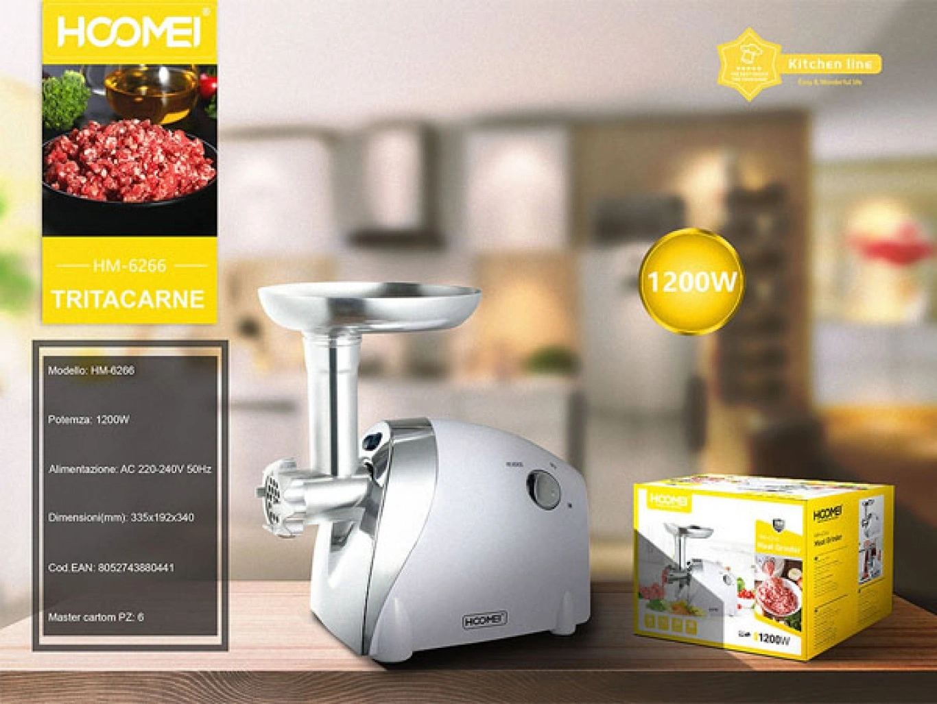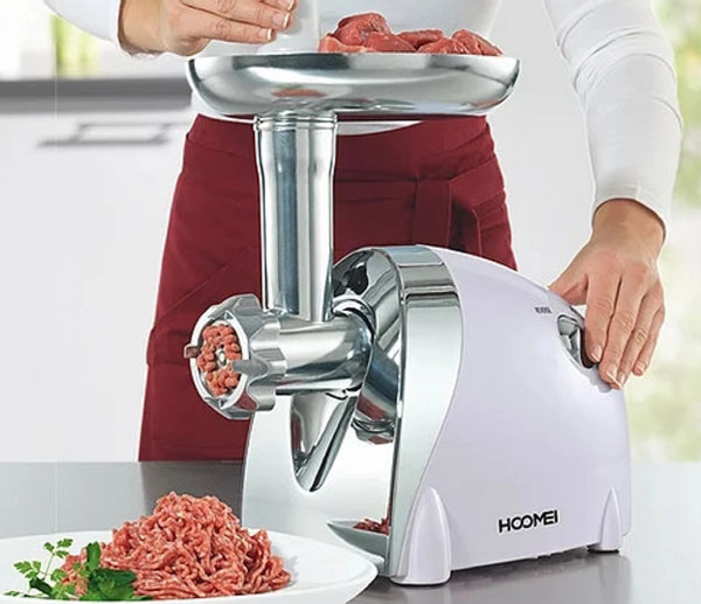 Μηχανή άλεσης κιμά HM-6266, της εταιρείας Hoomei, με ισχύ 1200 Watt. Είναι κατάλληλη για να φτιάξετε μόνοι σας σπιτικό κιμά από μοσχάρι, χοιρινό, κοτόπουλο ή ακόμα και ψάρι.