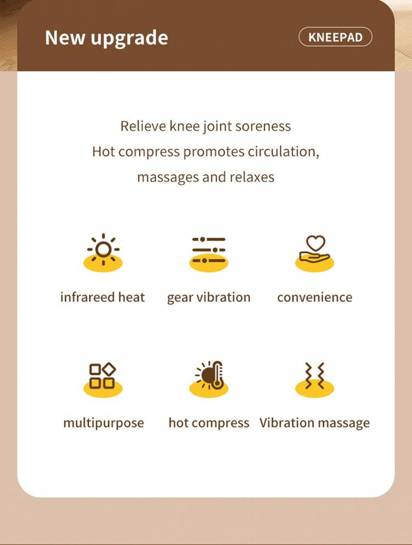 Απολαύστε ανακούφιση και φροντίδα για τα γόνατά σας με αυτήν την προηγμένη συσκευή που συνδυάζει θερμή συμπίεση και θεραπεία δόνησης. Η στοχευμένη δράση της βοηθά στη μείωση του πόνου και της δυσκαμψίας, προσφέροντας ευχάριστη αίσθηση χαλάρωσης και άνεσης.