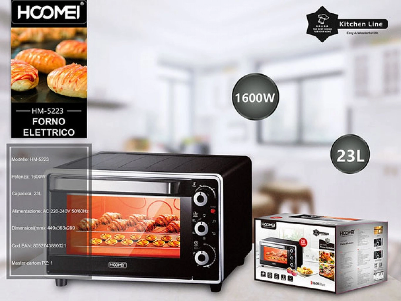 Ηλεκτρικό φουρνάκι HM-5223, της εταιρείας Hoomei, με ισχύ 1600 Watt. Η χωρητικότητα του είναι 23 λίτρα και μπορεί να χρησιμοποιηθεί ως βοηθητικός φούρνος για να ζεστάνετε ή να ψήσετε γρήγορα μικρές ποσότητες φαγητού.