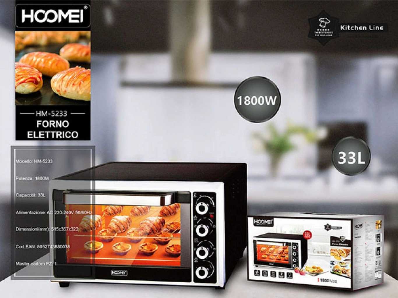 Ηλεκτρικό φουρνάκι HM-5233, της εταιρείας Hoomei, με ισχύ 1800 Watt. Η χωρητικότητα του είναι 33 λίτρα και μπορεί να χρησιμοποιηθεί ως βοηθητικός φούρνος για να ζεστάνετε ή να ψήσετε γρήγορα μικρές ποσότητες φαγητού, χωρίς να χρειάζεται να ανάψετε την κουζίνα σας. Είναι κατάλληλο για χρήση σε εξοχικά, φοιτητικά σπίτια ή επαγγελματικούς χώρους. Ο χρονοδιακόπτης που διαθέτει σας επιτρέπει να προγραμματίζετε τη λήξη του μαγειρέματος και παράλληλα σας απαλλάσει από το άγχος της συνεχούς παρακολούθησης της πορείας του μαγειρέματος.