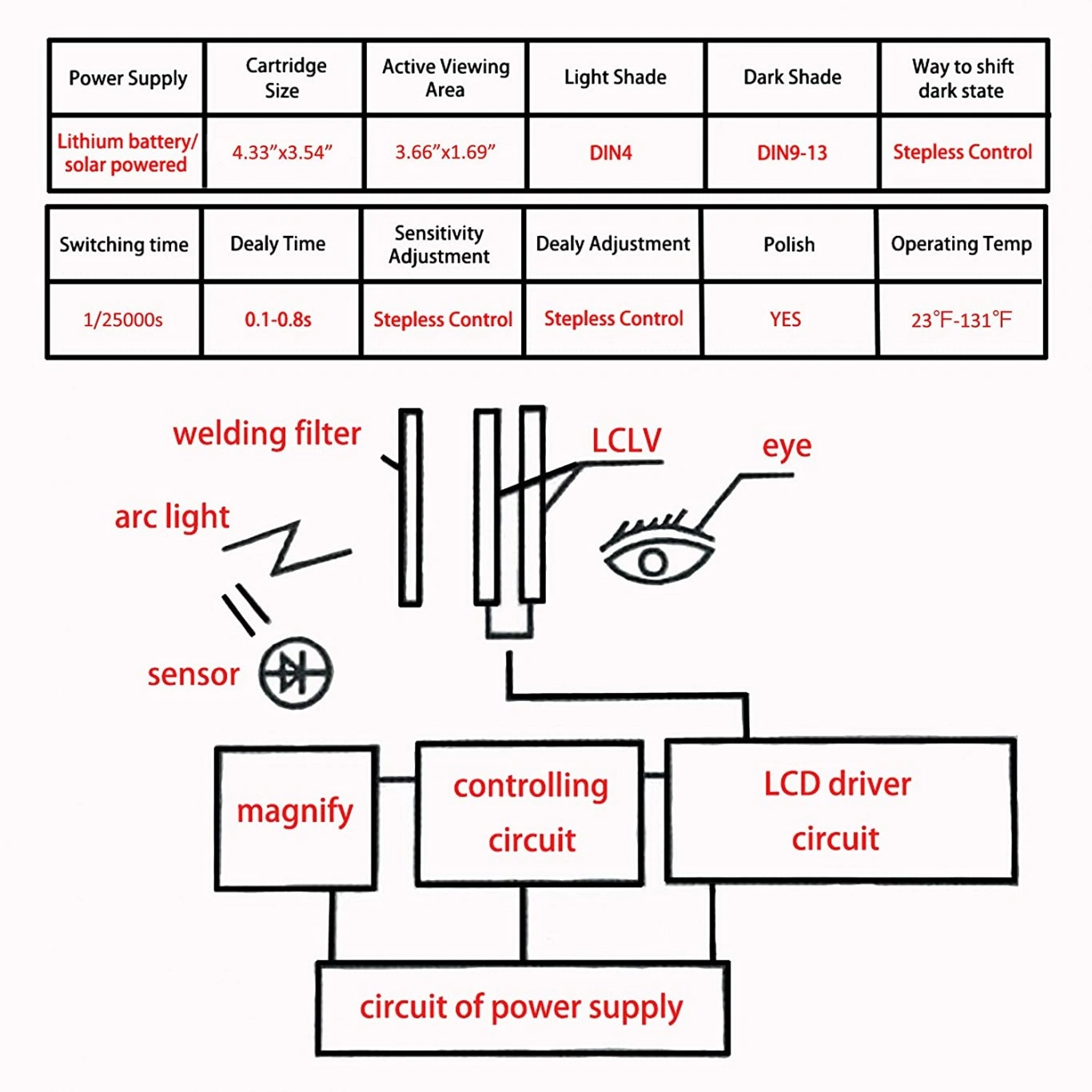 • Μάσκα – κράνος ηλεκτροκόλλησης κατάλληλη για ηλεκτροσυγκολλήσεις MIG, TIG & Arc (MMA / GMAW)• Με εσωτερικές λωρίδες στήριξης 4 σημείων ρύθμισης για συγκράτηση γύρω από τη κεφαλή• Η μπροστινή λωρίδα (που εφαρμόζει στο προσκέφαλο) είναι επενδυμένη με ύφασμα για άνετη εφαρμογή• Το αυτόματο φίλτρο σκίασης διαθέτει ροοστάτες για την καθυστέρηση (delay) και για την ευαισθησία φωτός (sensitivity) αλλά και ροοστάτη για το ποσοστό επισκίασης (έως και απόλυτο σκοτάδι)• Με διπλούς αισθητήρες φωτός για μετάβαση από το φως στο σκοτάδι σε 1/30.000sec και από το σκοτάδι στο φως σε 0.15s ~0.8s• Με ρύθμιση σκιάς DIN4 και από DIN 9 έως DIN 13• Προστασία UV/IR: DIN 16• Η μάσκα μπορεί να ρυθμιστεί οριζόντια πάνω από το κεφάλι όταν δεν δουλεύετε και κάθετα μπροστά στο πρόσωπο όταν εργάζεστε• Θερμοκρασίες λειτουργίας από -5°C έως 55° ή(23°F ~ 131°F)• Θερμοκρασίες αποθήκευσης από -20°C ~ 70° ή(-4°F ~ 158°F)• Τροφοδοσία μέσω του ηλιακού πάνελ και από επαναφορτιζόμενες μπαταρίες λιθίου