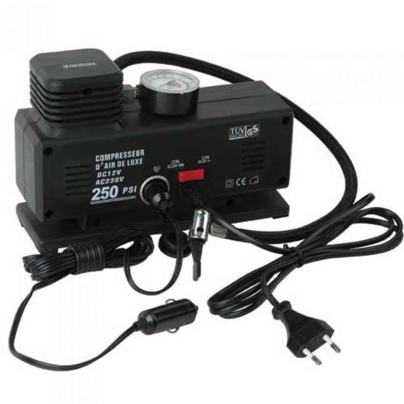 Φορητό κομπρεσέρ αυτοκινήτου 12V για να φουσκώσετε λάστιχα, μπάλες, στρώματα κ.λ.π. Διαθέτει τροφοδοσία ρεύματος 220V για εγκατάσταση σε πρίζα και χρήση οικιακή.  Επίσης διαθέτει καλώδιο με φίσες για τον αναπτήρα του αυτοκινήτου για να μπορείτε να το πάρετε παντού.