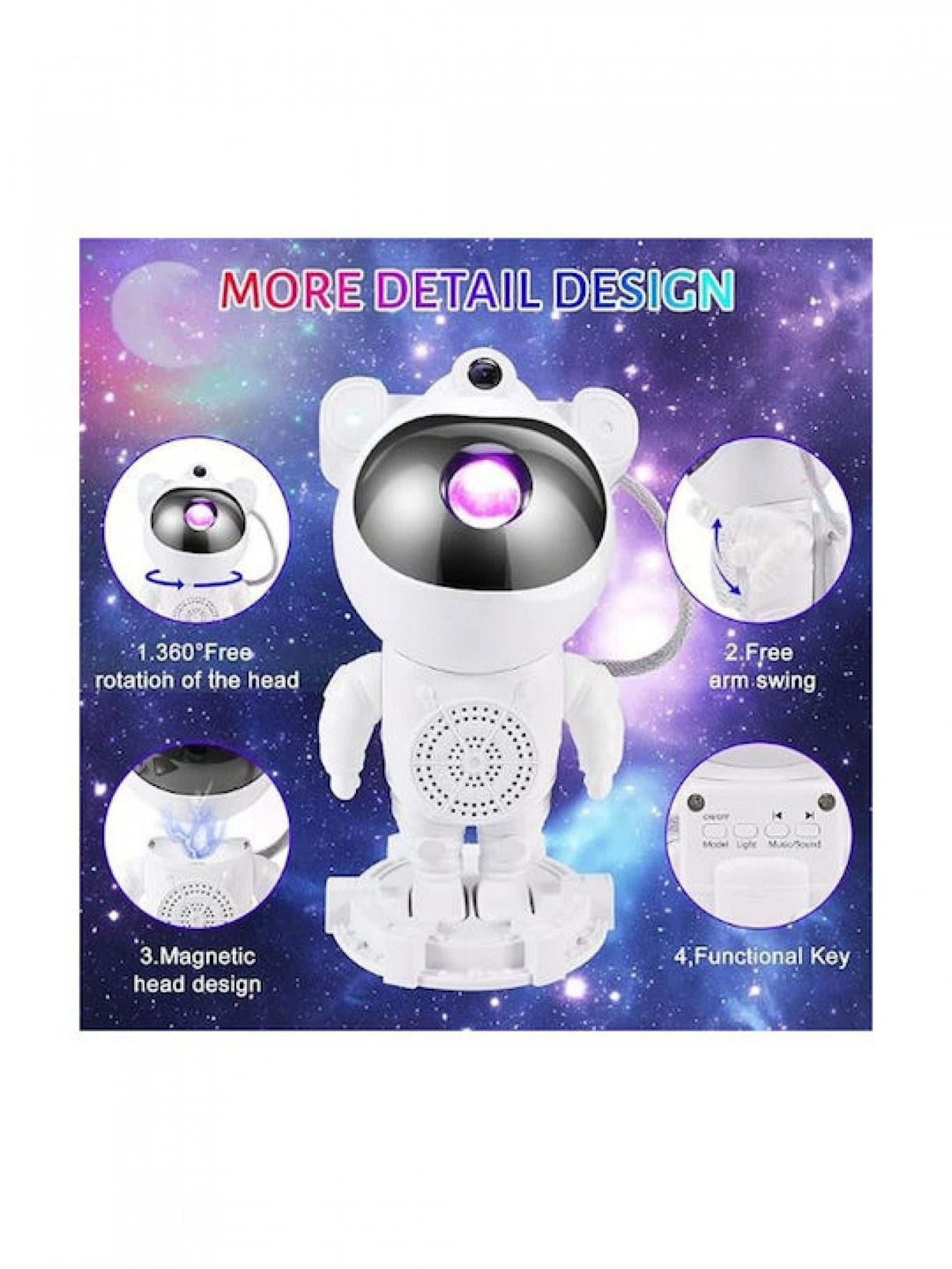 Το κεφάλι του αστροναύτη μπορεί να περιστραφεί 360° με μαγνητική δύναμη, προβάλλοντας το νεφέλωμα σε οποιοδήποτε μέρος χωρίς περιορισμό.