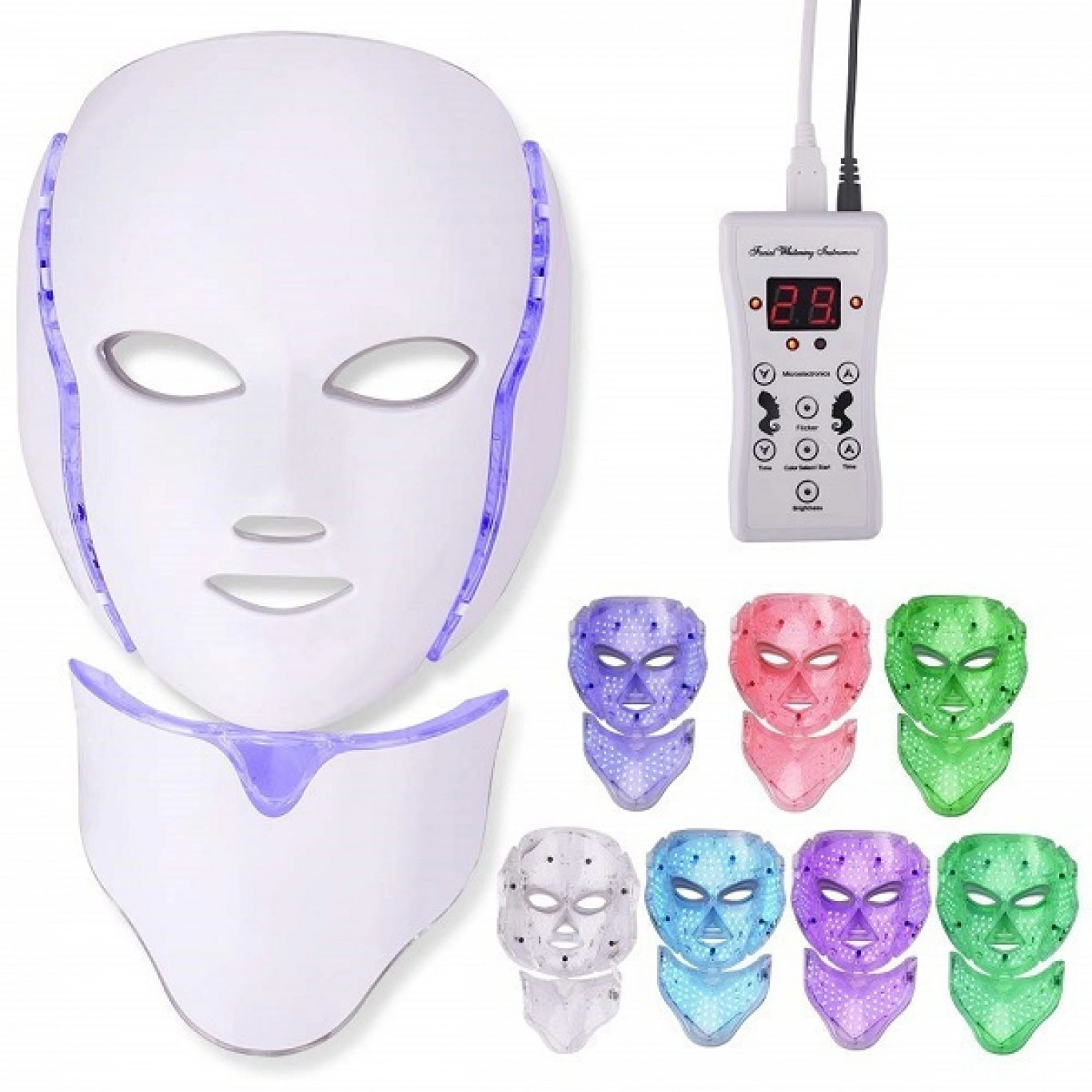 Μάσκα LED με 7 διαφορετικές αποχρώσεις, οι οποίες καταπολεμούν ακμή, ρυτίδες, χαλάρωση, πανάδες και δυσχρωμίες. Το δέρμα αναγεννιέται και απελευθερώνεται από βακτηρίδια, διχρωμίες και ρυτίδες.
