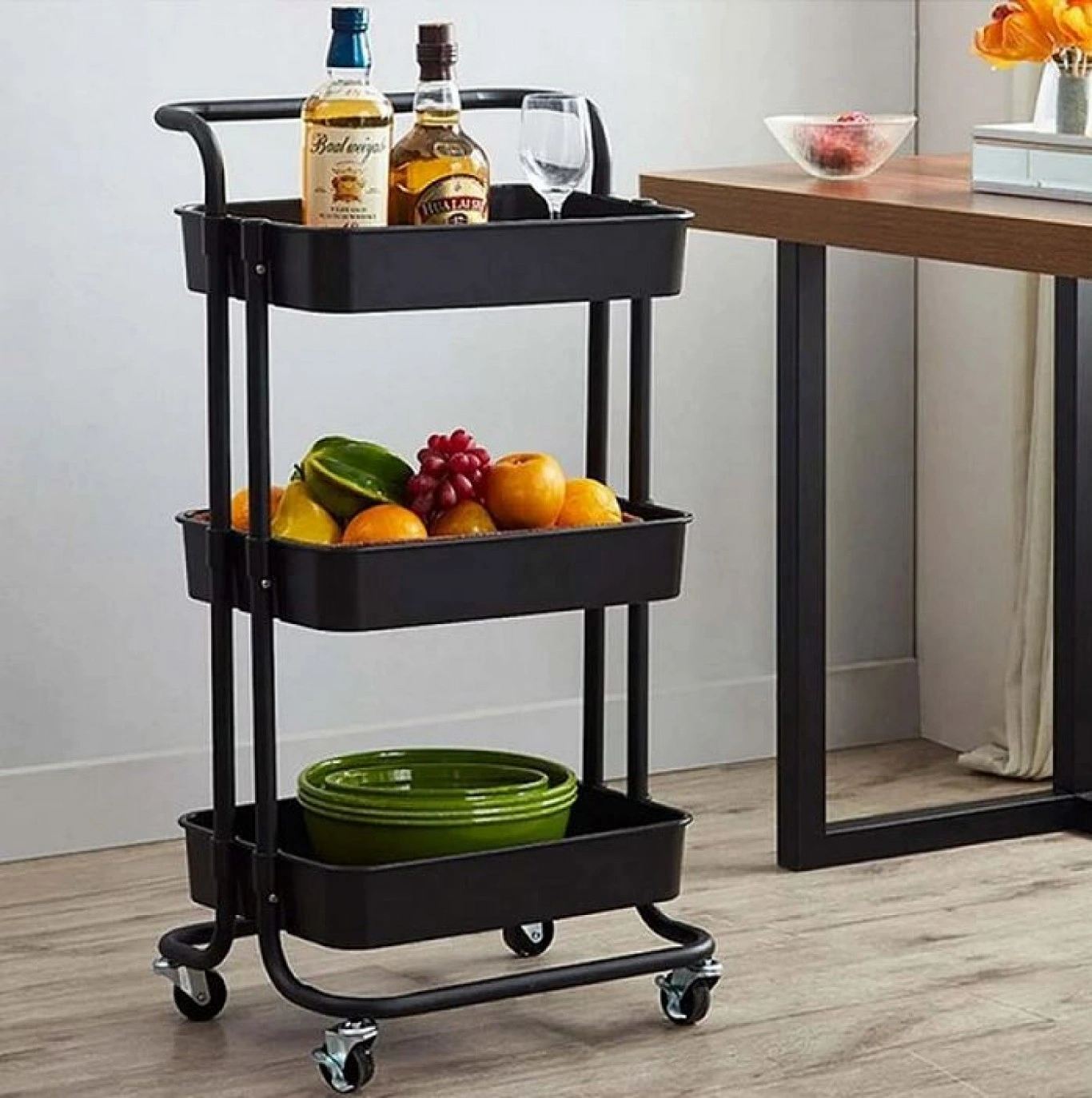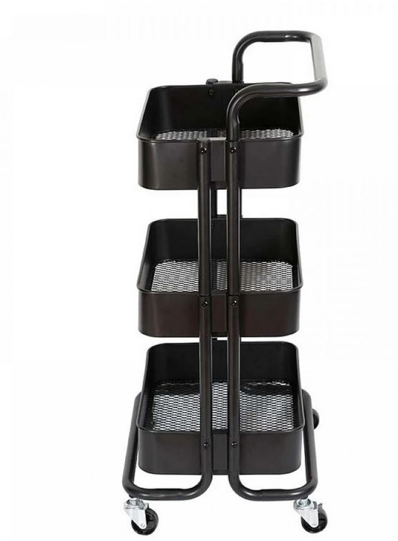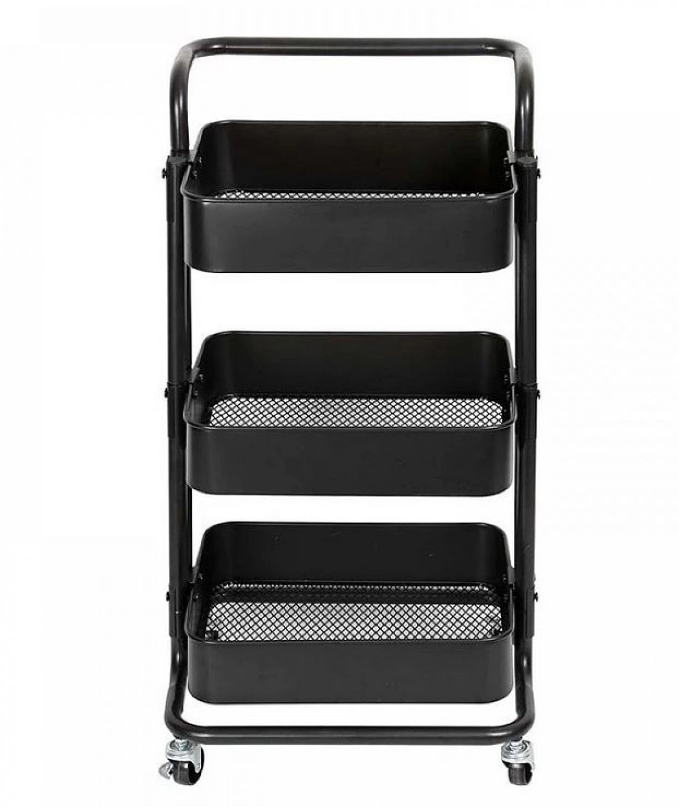 Αυτό το τρόλεϊ κουζίνας είναι η ιδανική λύση για την οργάνωση και την αποθήκευση των αντικειμένων σας. Κατασκευασμένο από υψηλής ποιότητας μέταλλο, εγγυάται μέγιστη αντοχή και σταθερότητα, ενώ το μαύρο χρώμα του προσδίδει μία κομψή και μοντέρνα εμφάνιση που ταιριάζει σε κάθε χώρο.