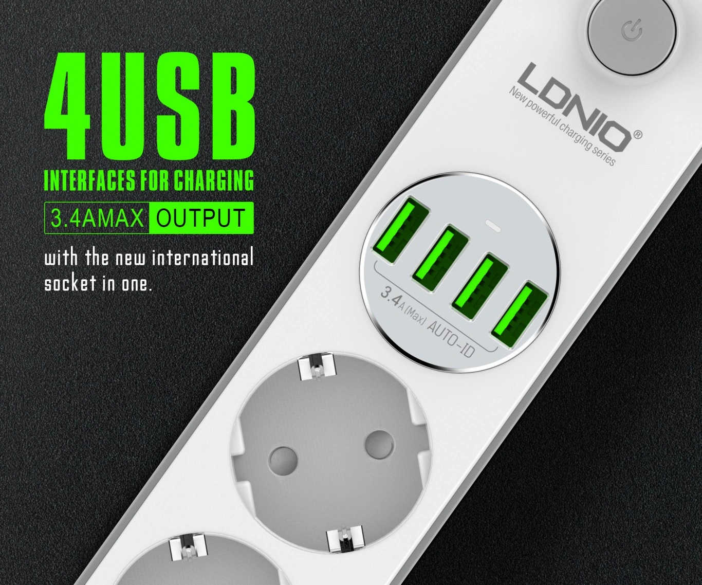 Πολύπριζο Ασφαλείας 4 Θέσεων με 4 Θύρες USB 3.4A LDNIO®