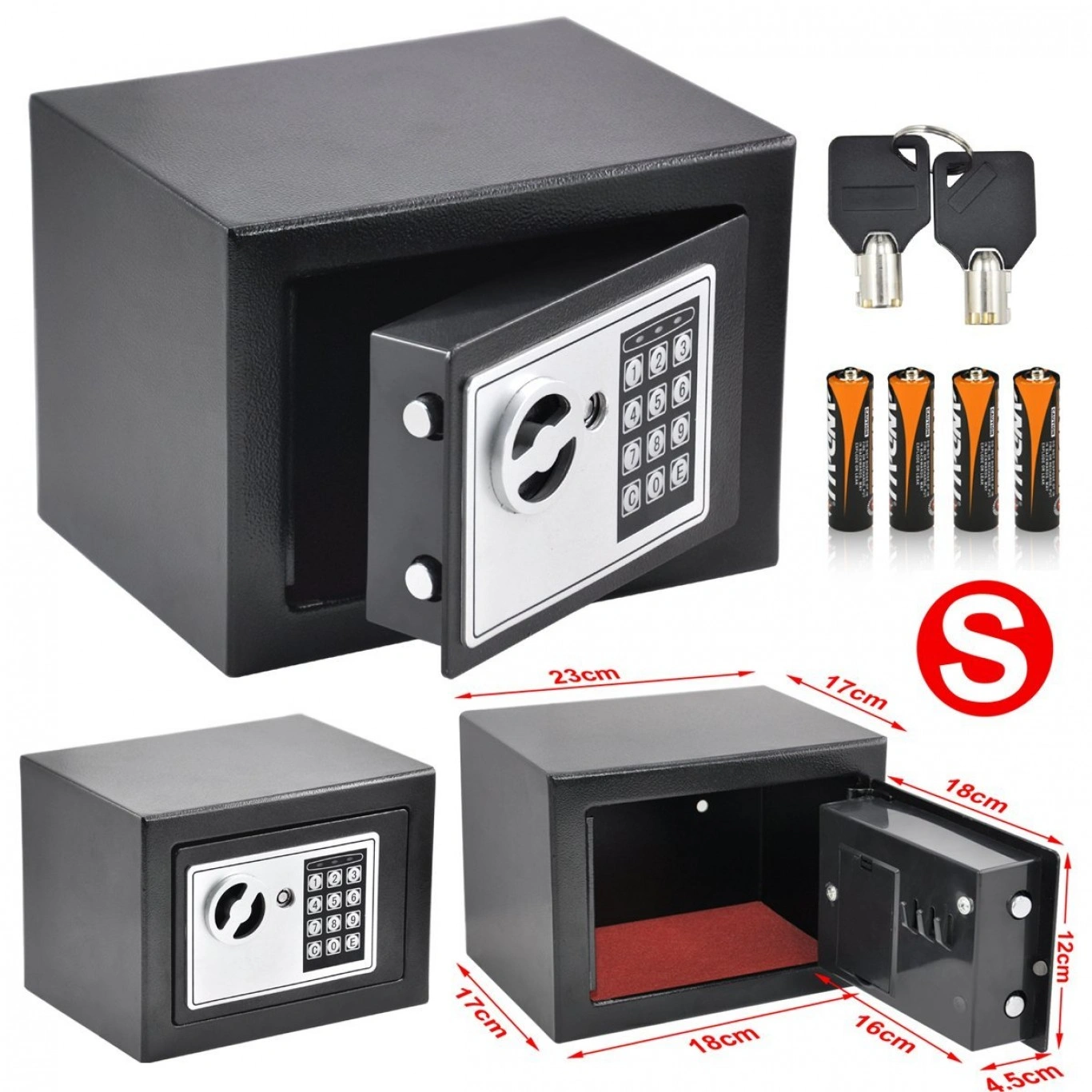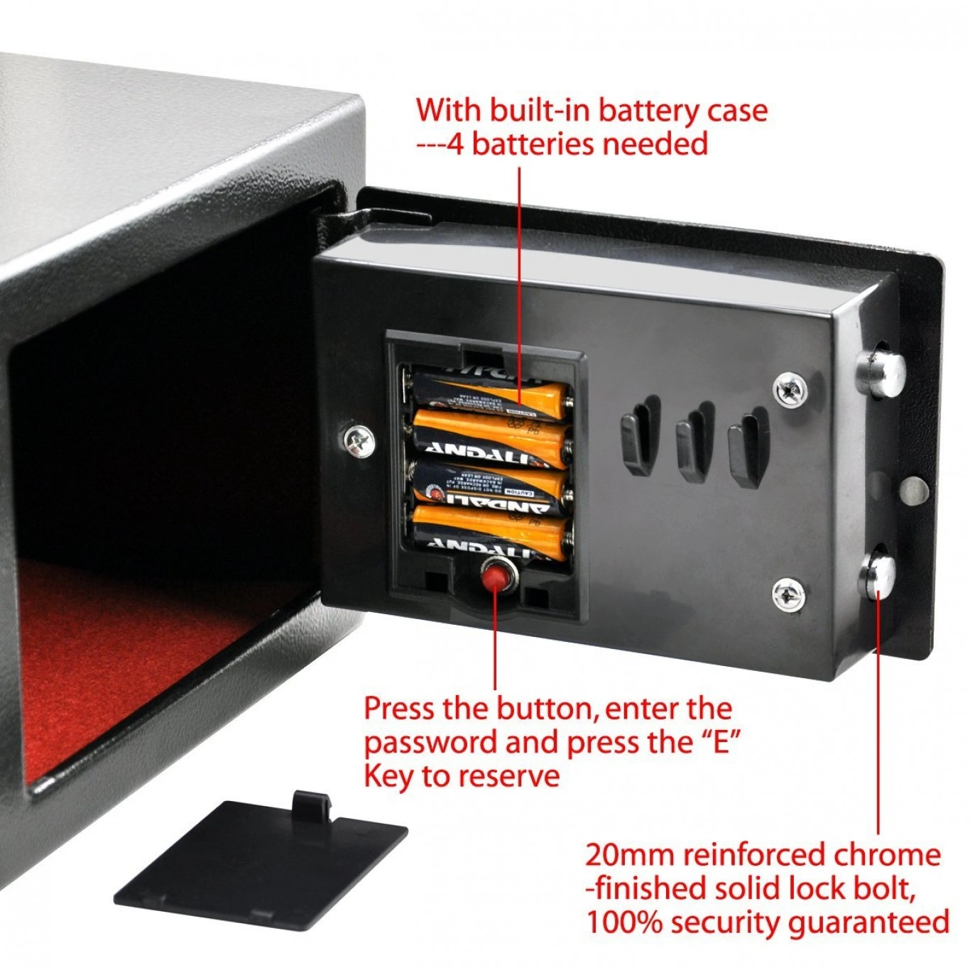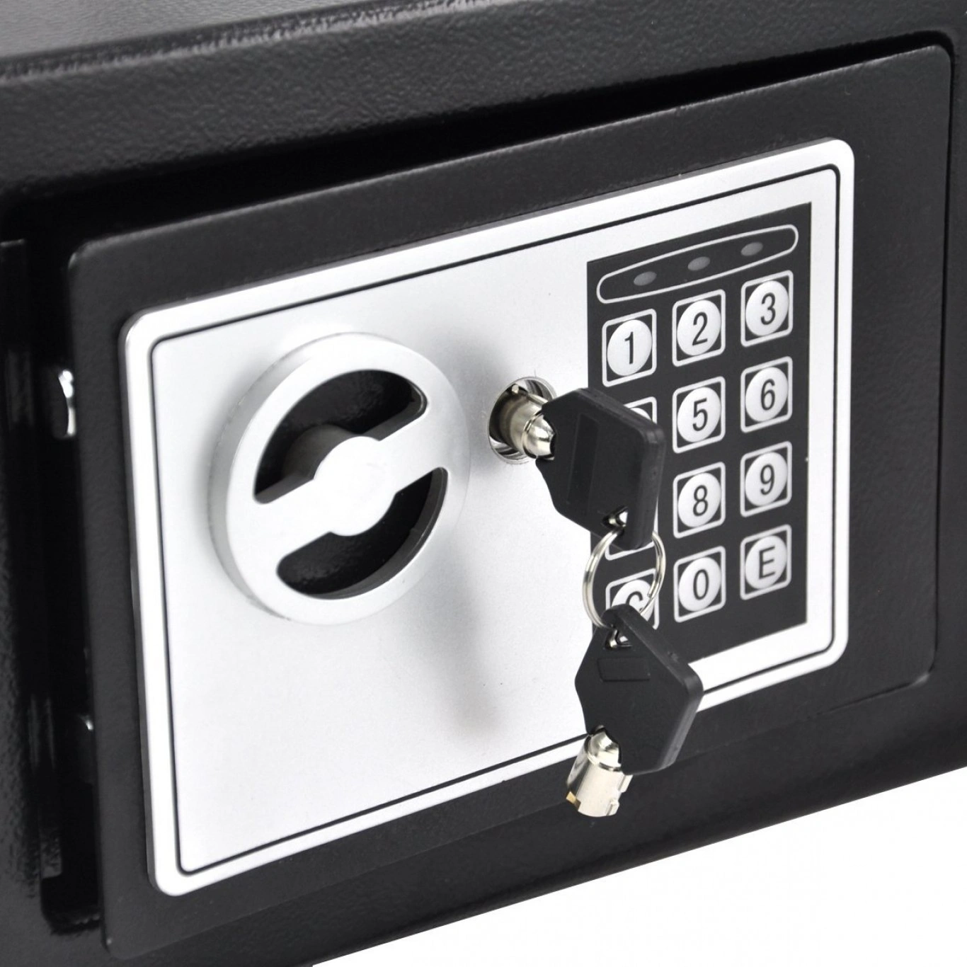 Χρηματοκιβώτιο ασφαλείας με ηλεκτρονική κλειδαριά. Σε περίπτωση εξάντλησης της μπαταρίας υπάρχει και κλειδαριά ασφαλείας. Προγραμματιζόμενος κωδικός από 3 έως 8 ψηφία. Ένδειξη χαμηλής τάσης μπαταρίας. Στήριξη σε οριζόντια ή κατακόρυφη επιφάνεια με μεταλλικά ούπα (περιλαμβάνονται).