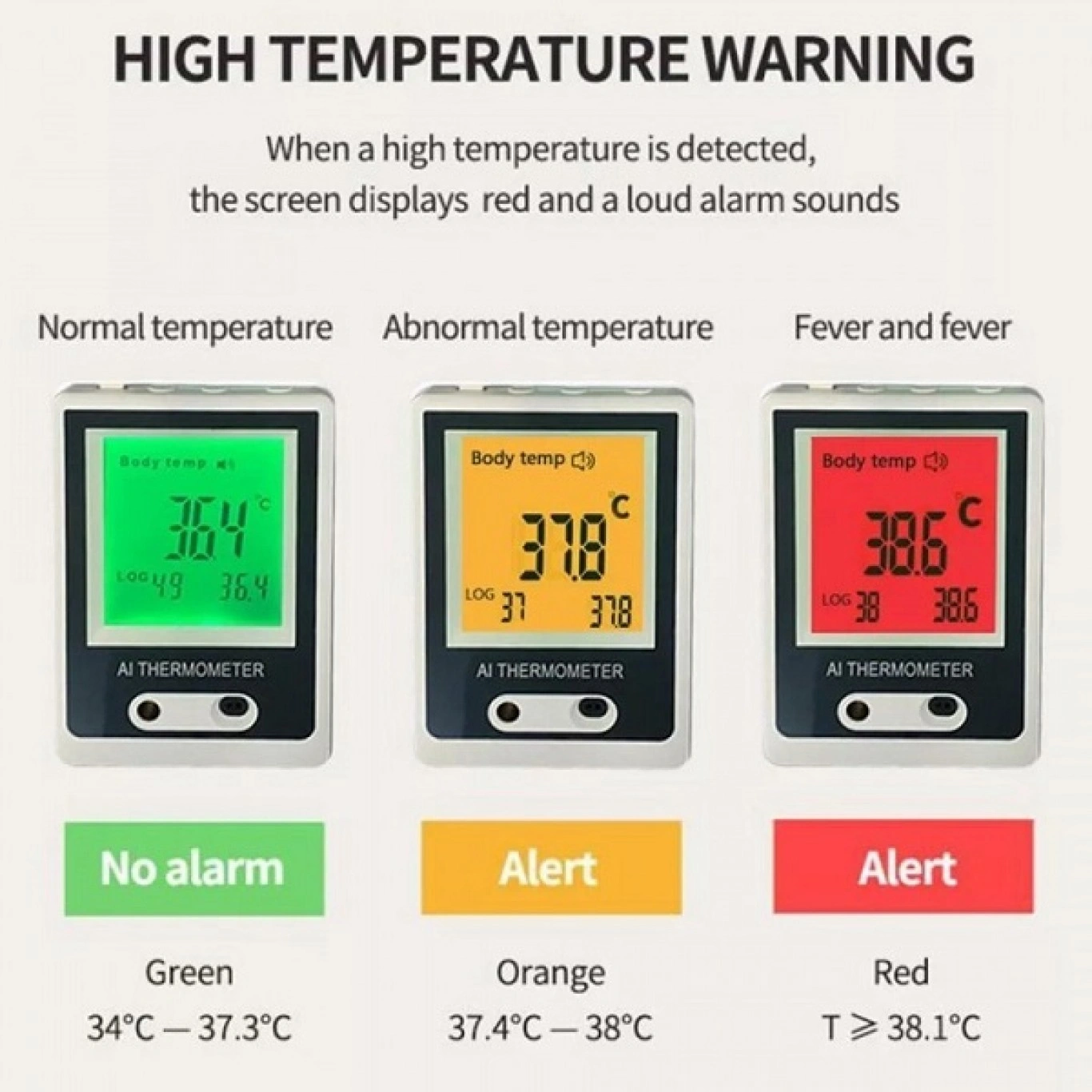 ✔️Διαθέτει έγχρωμη πράσινη οθόνη, η οποία γίνεται πορτοκαλί σε περίπτωση μη φυσιολογικής θερμοκρασίας ή κόκκινη αν ανιχνευθεί  πυρετός.