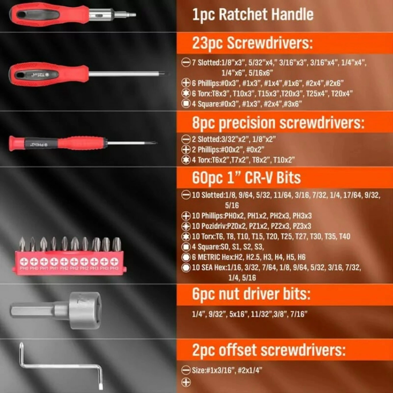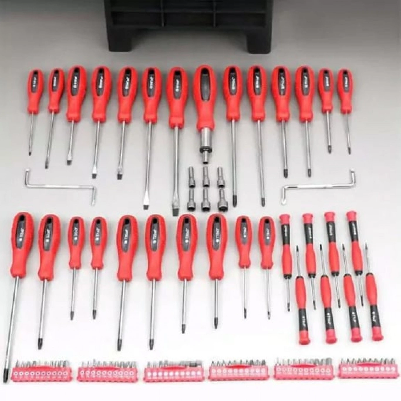 • Διπλή έγχρωμη λαβή για μέγιστη ροπή• Μαγνητικές άκρες για εύκολο χειρισμό• Ανοξείδωτος χάλυβα για μεγάλη αντοχή• Ανθεκτική πλαστική βάση οργάνωσης :• 6 x ¼” Dr. socket: 5mm, 6mm, 7mm, 8mm, 10mm, 12mm• 2 x 150mm offset κατσαβίδια: SL6 x PH2, SL5 x PH• 11 x Μαλακή χειρολαβή καστάνια• 23 x Κατσαβίδια:• – Slot: SL3 x 75mm, 4 x 100mm, 4 x 100mm, 5 x 75mm, 5 x 100mm, 5 x 125mm, 6 x 100mm, 6 x 150mm, 8 x 150mm• – Cross point: PH0 x 75mm, PH1 x 75mm, PH1 x 100mm, PH1 x 125mm, PH2 x 100mm, PH2 x 150mm• – Star: T8 x 75mm, T10 x 75mm, T15 x 75mm, T20 x 75mm• – Square: S0 x 75mm, S1 x 75mm, S1 x 100mm, S2 x 100mm• 60x25mm μύτες:• -Slot: 3, 3, 4, 4, 5 , 5, 5, 6, 6, 6• -Cross point: PH0, PH0, PH1, PH1, PH2, PH2, PH2, PH3, PH3, PH3• -Pozi: PZ0, PZ0, PZ1, PZ1, PZ2, PZ2, PZ2, PZ3, PZ3, PZ3• -Star: T7, T8, T9, T10, T15, T20, T25, T27, T30, T40• -Hex: 2, 2.5, 3, 3, 4, 4, 5, 5, 5.5, 6• -Square: S0, S0, S1, S1, S2, S2, S2, S3, S3, S3• 8x50mm κατσαβίδια ακριβείας:• -Slot: 1.5, 2.5• -Cross point: PH00, PH0• -Star: T6, T7, T8, T9