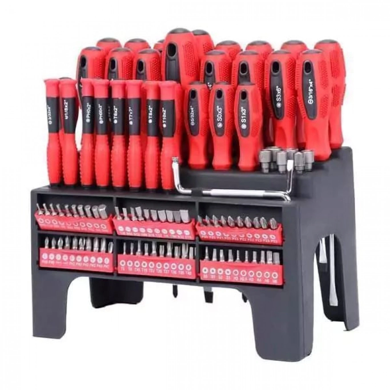 Σετ 100 Μαγνητικών Κατσαβιδιών από Ανοξείδωτο Χάλυβα με Ραφιέρα – Βάση