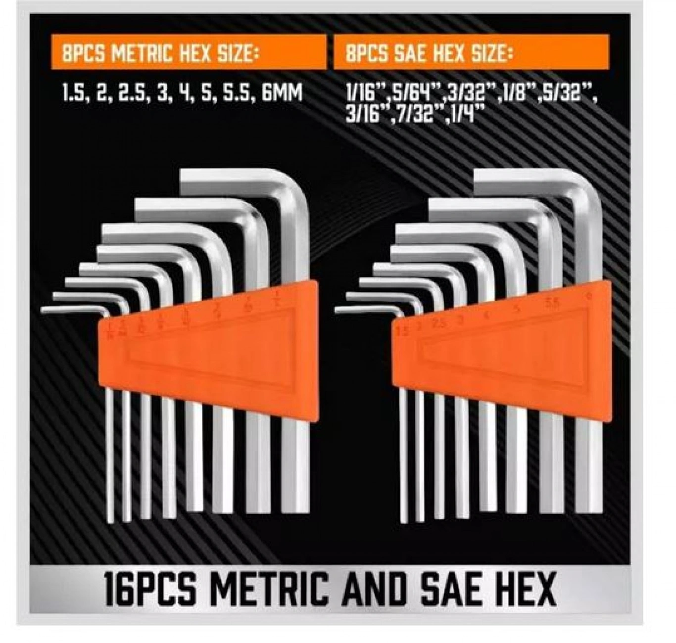 • 8pcs Sae Hex Size : 1/16″, 5/64″, 3/32″, 1/8″, 5/32″, 3/16″, 7/32″, 1/4″