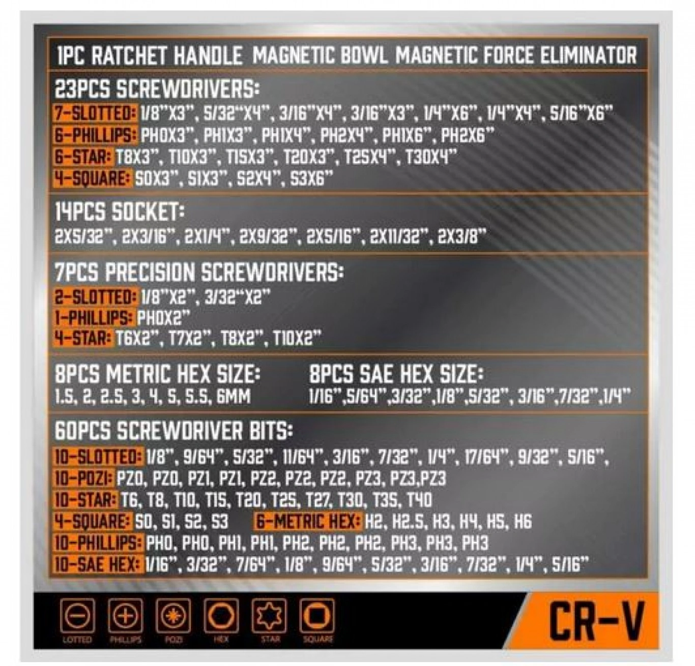 • 7-SLOTTED: 1/8” X 3”, 5/32” X 4”, 3/16” X 4”, 3/16” X 3”, 1/4” X 6”, 1/4” X 4”, 5/16” X 6”