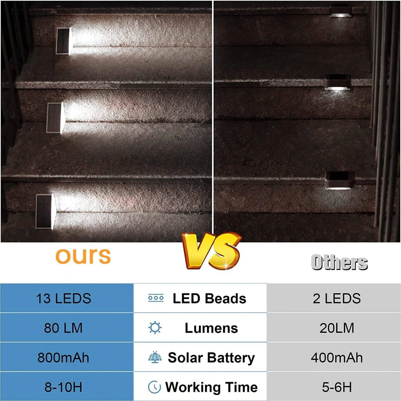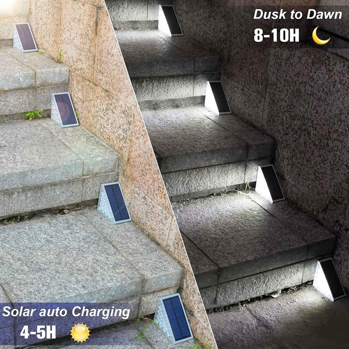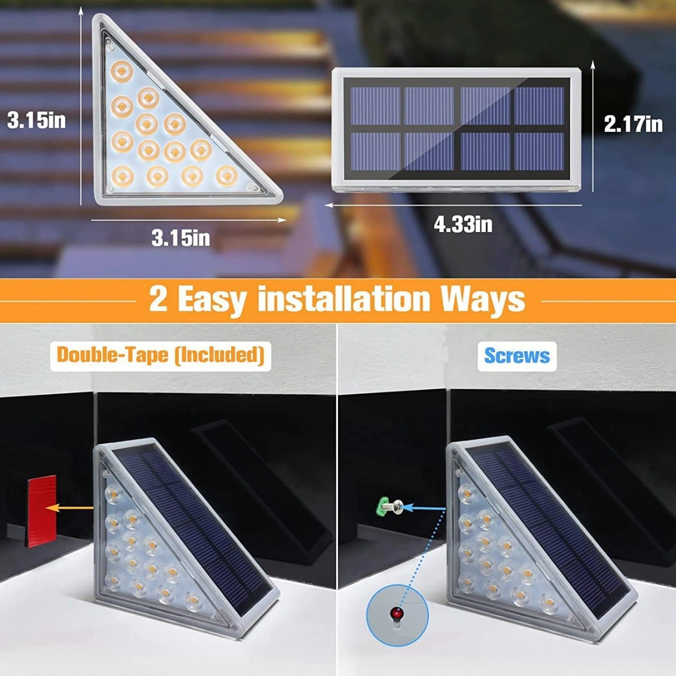 Σετ με επιτοίχια ή επιδαπέδια ηλιακά φωτιστικά ιδανικά για τοποθέτηση σε γωνίες τοίχων ή σκάλες. Λειτουργούν και φωτίζουν αυτόνομα καθώς φορτίζουν κατά την διάρκεια της ημέρας με τον ήλιο ενώ ανάβουν αυτόματα όταν σκοτεινιάσει.✔️ Φωτοκύτταρο. Ανάβει αυτόματα όταν σκοτεινιάσει και σβήνουν αυτόματα την μέρα✔️ Με 13 λαμπτήρες LED θερμού φωτισμού το κάθε φωτιστικό✔️ Εύκολη τοποθέτηση είτε με αυτοκόλλητα (περιέχονται) είτε βιδωτά με ούπα (περιέχονται)Κάθε φωτιστικό συγκεντρώνει και αποθηκεύει ηλιακή ενέργεια κατά την διάρκεια της ημέρας σε ενσωματωμένες επαναφορτιζόμενες μπαταρίες, ώστε να μη χρειάζεται να συνδεθεί σε παροχή ρεύματος. Διαθέτει φωτοκύτταρο έτσι ώστε να ανάβει αυτόματα όταν πέσει το φως του ήλιου. Έτσι, λειτουργεί πλήρως αυτόνομα, δίχως να έχετε στο νου σας μπαταρίες ή να τα ανάψετε εσείς. Φωτίστε εντυπωσιακά σκάλες και κάθε γωνία τοίχων στο γκαράζ σας, τον κήπο σας κλπ.✔️ Ιδανικό για σημεία στα οποία δεν μπορεί να φτάσει παροχή ρεύματος.
