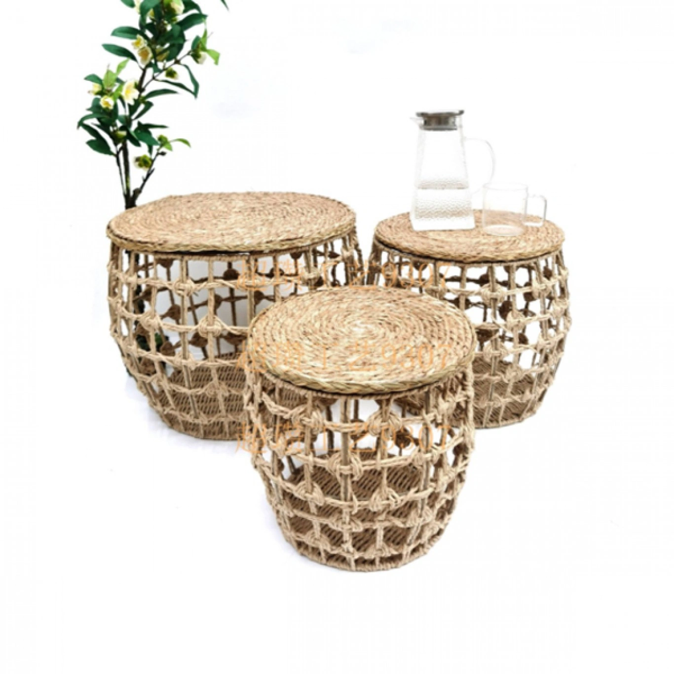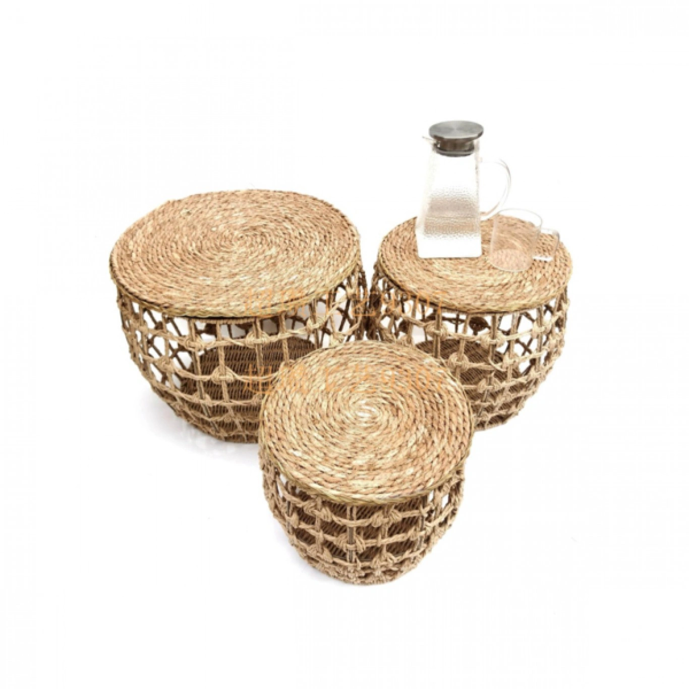 Καλάθια από φυσικό υλικό με καπάκι σε σετ των τριών τεμαχίων. Μπορούν να χρησιμοποιηθούν και ως βοηθητικά τραπέζια.