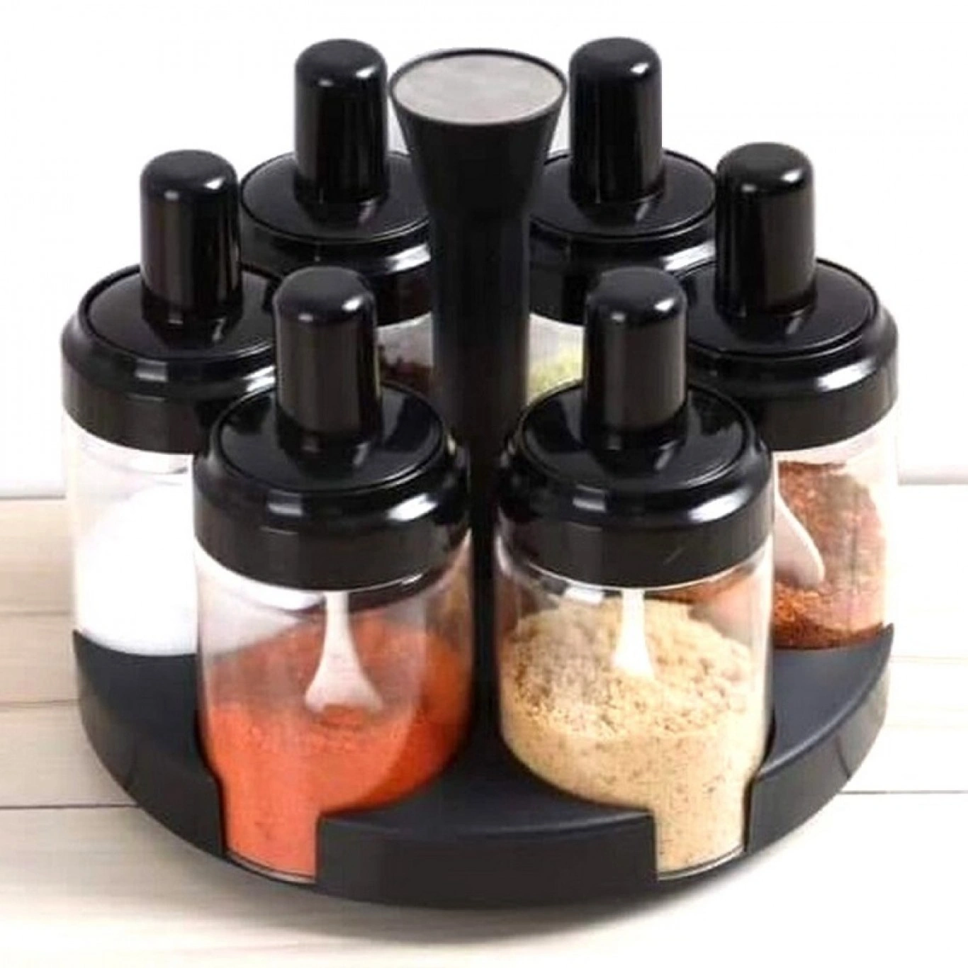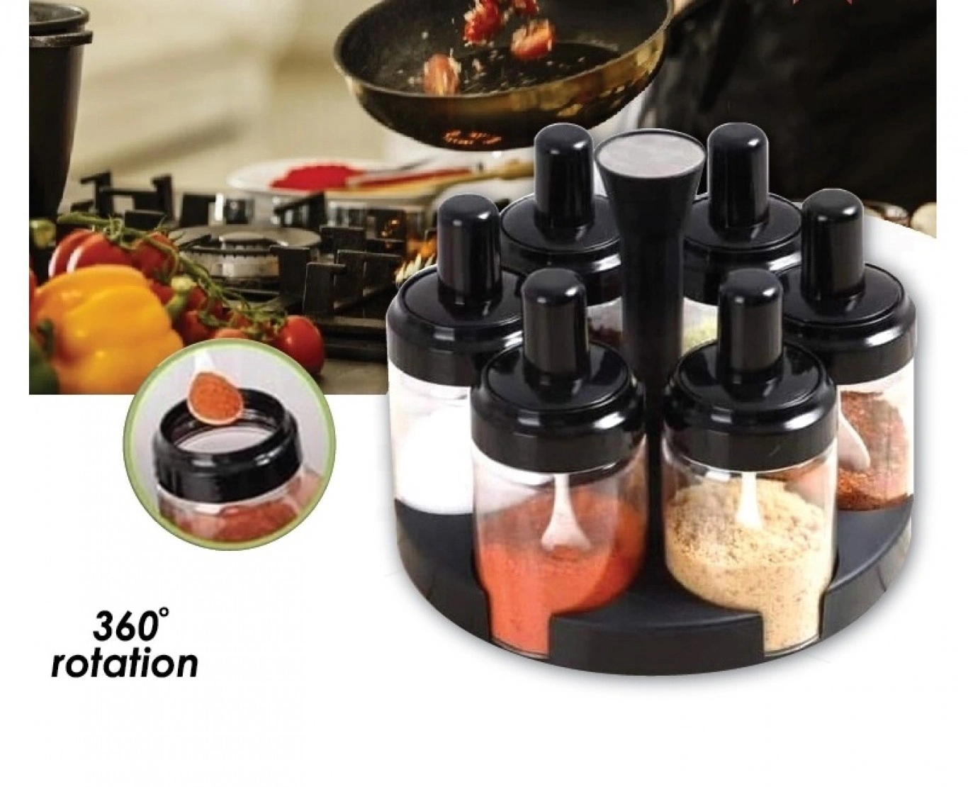 Σετ με 6 δοχεία μπαχαρικών σε περιστρεφόμενη πλαστική βάση, με όμορφο και μοντέρνο σχεδιασμό, χάρη στον οποίο θα ταιριάζει απόλυτα στο εσωτερικό της κουζίνας.