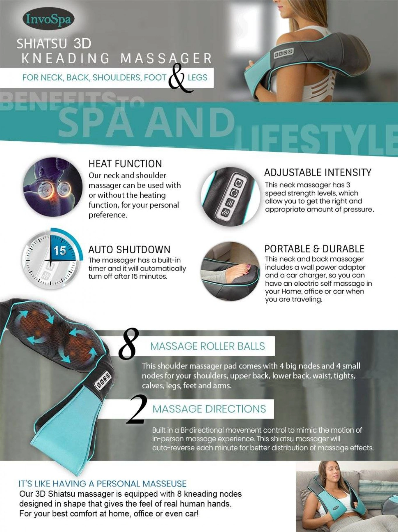 ✔️Διαθέτει 6 κυλίνδρους (μπάλες μασάζ) που κάνουν κυκλικές κινήσεις με σχεδιασμό U (U-DESIGN) για τέλεια εφαρμογή στον αυχένα ενώ ταυτόχρονα εκλύουν και θερμότητα. Θα σας βοηθήσει στην τόνωση της κυκλοφορίας του αίματος και την χαλάρωση των κουρασμένων μυών!