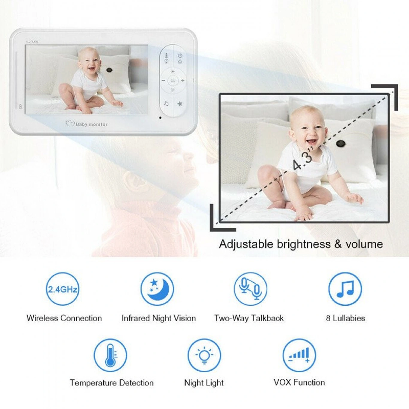 Σετ παρακολούθησης για το δωμάτιο του μωρού σας, το οποίο περιλαμβάνει μια έγχρωμη οθόνη LCD και μια κάμερα με υπέρυθρη νυχτερινή όραση. Θα σας βοηθήσει να παρατηρείτε το μωρό σας μέρα και νύχτα.