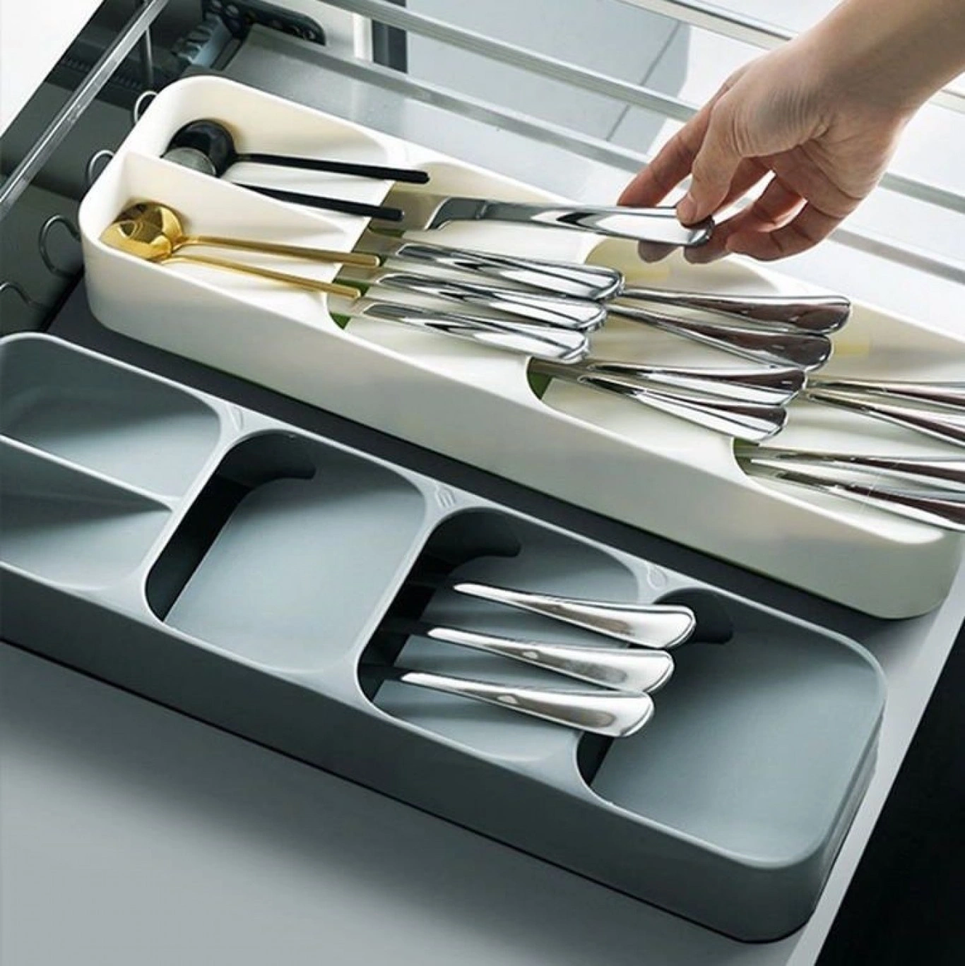 Διαθέτει πέντε επικαλυπτόμενα διαμερίσματα για να τοποθετείτε μαχαιροπήρουνα, κερδίζοντας ετσι πολύτιμο χώρο στο συρτάρι σας.