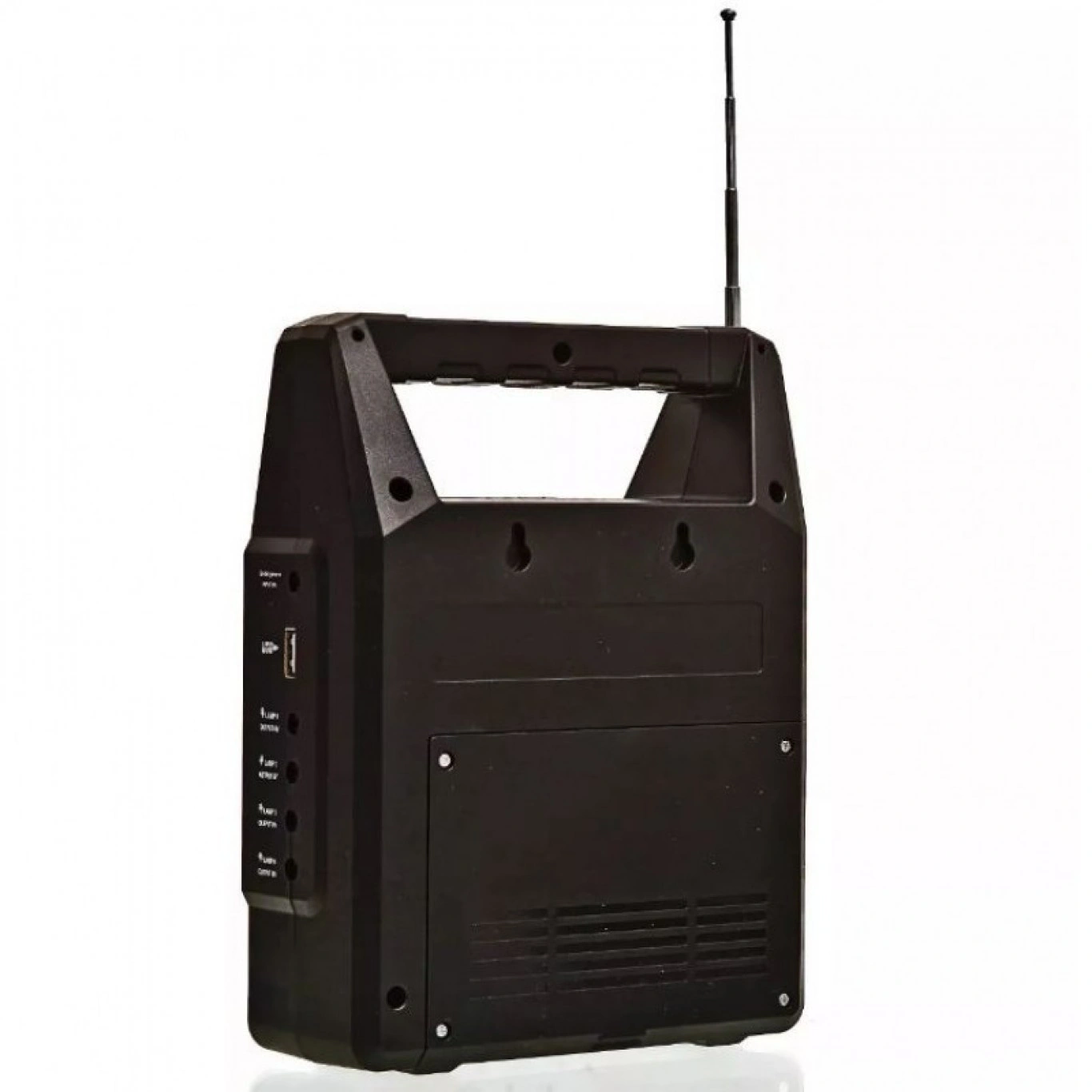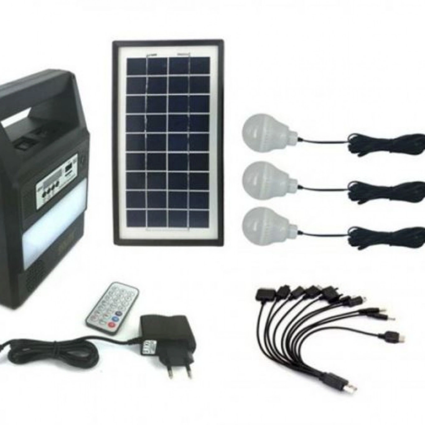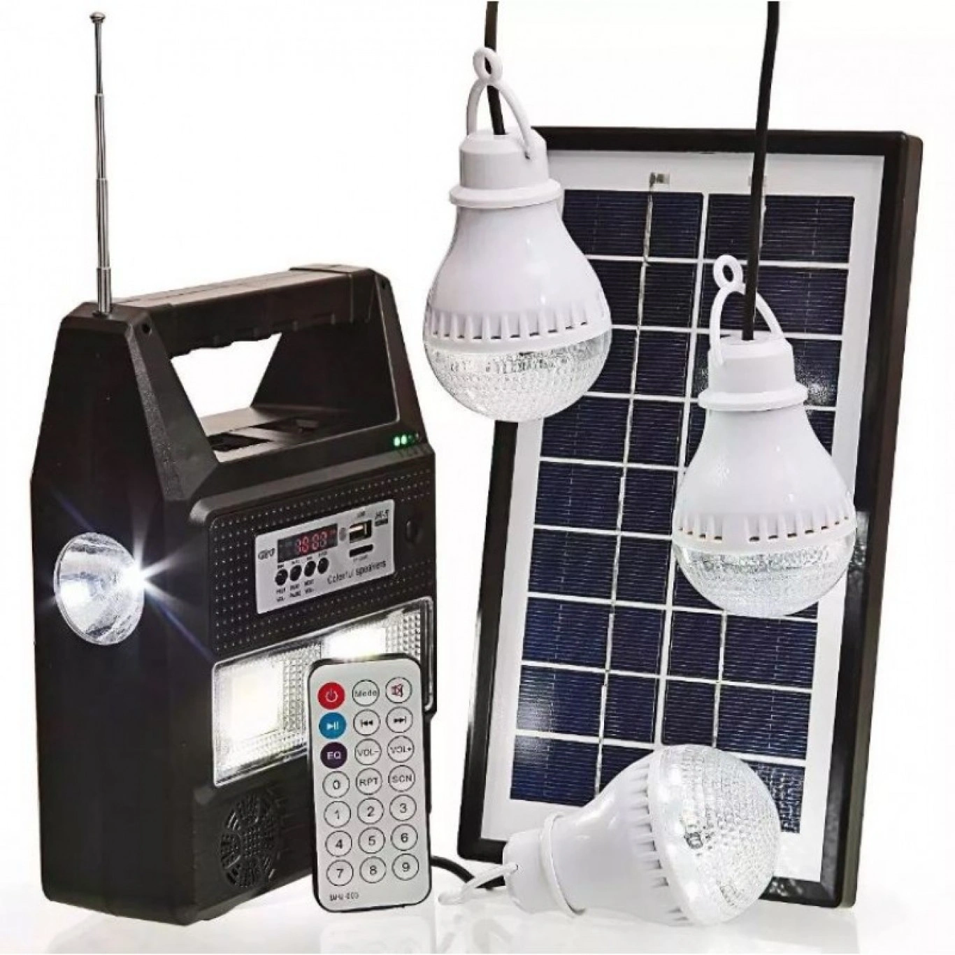 Πλήρες ηλιακό τηλεχειριζόμενο πακέτο φωτισμού με ηλιακό panel, μπαταρία πολύ ισχυρό φακό και φωτιστικό LED, 200 και 400 Lumens, θύρα usb για φόρτιση συσκευών, 3 λάμπες led 100 Lumens, πλεξούδα usb με αντάπτορες για φόρτιση διαφορετικών συσκευών και κινητών τηλεφώνων και ηχείο USB/SD Mp3 Player καθώς και FM Ραδιόφωνο. Παρέχει εξαιρετικά μεγάλη αυτονομία και διάρκεια φωτισμού!
